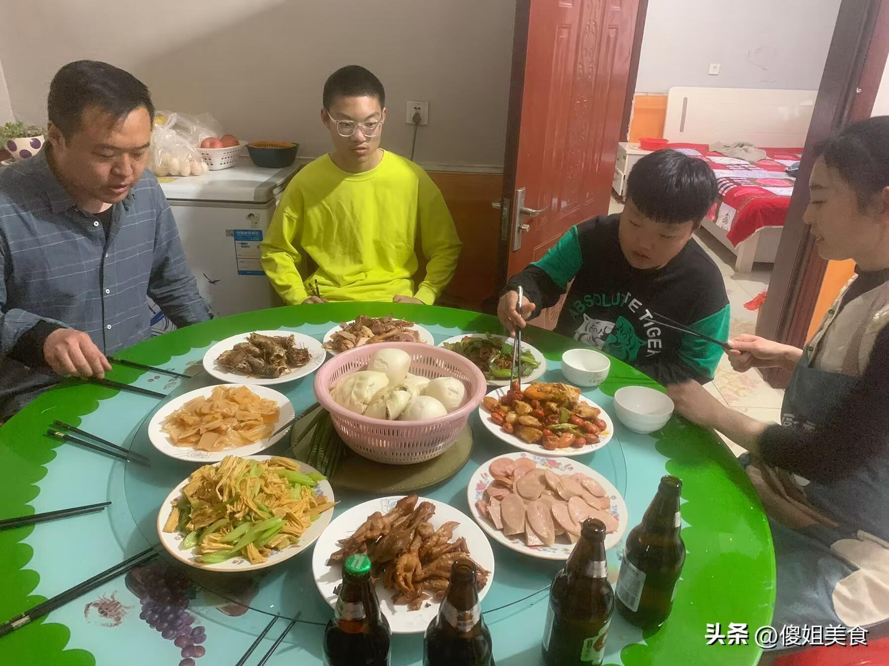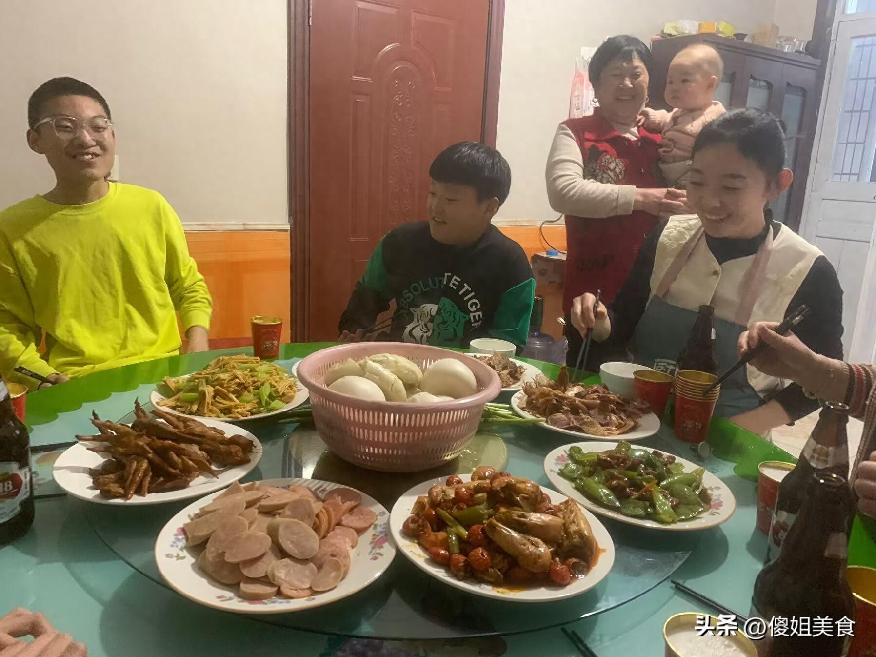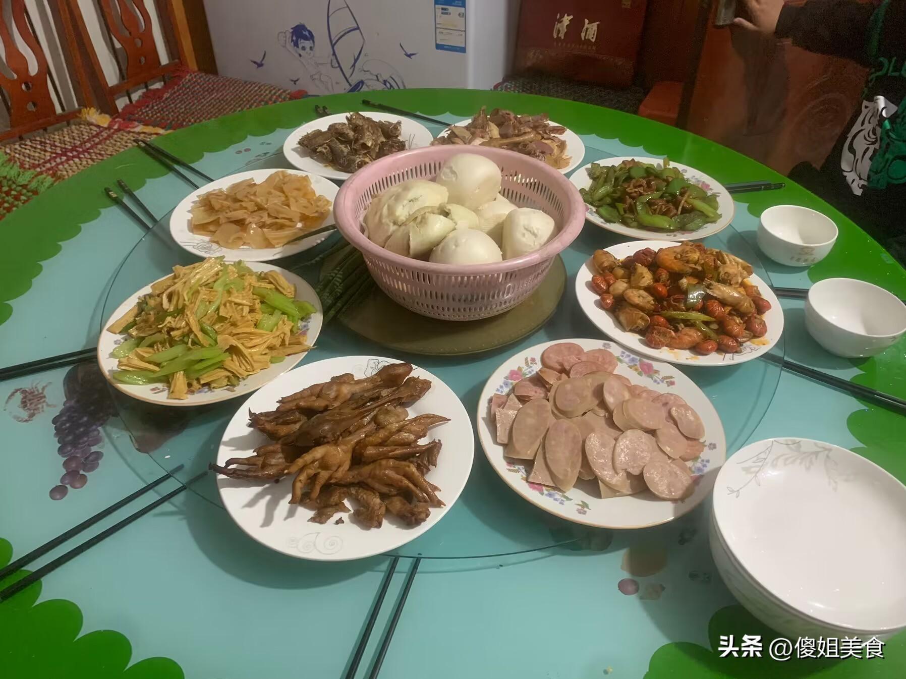 一共準備了8個菜,剩下那三個是炒腐竹、香腸和我們全家都愛喫的雞爪子,主食喫的是媽媽牌大包子。我們姐幾個好久沒見了,就喝了幾瓶酒,聊着開心的事情,太幸福了。