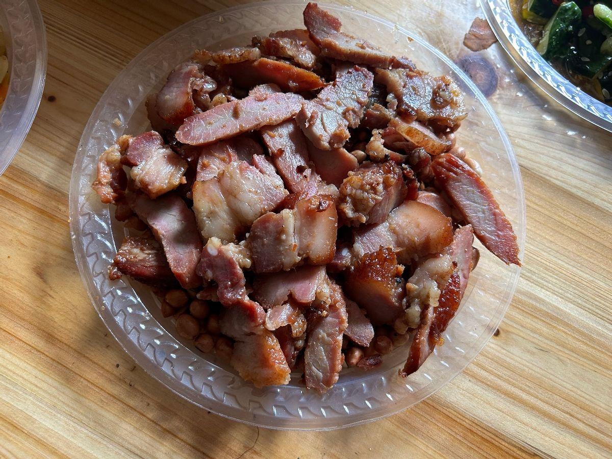 【花生米拼叉燒肉】這個叉燒肉是買的半成品,下面的花生米是自己炒的,簡單放一起,恰好是一道人人愛喫的下酒菜。叉燒肉在廣東和廣西地區,是常見的涼菜之一,在酒店的宴席上,經常可以看到有叉燒做的冷盤。