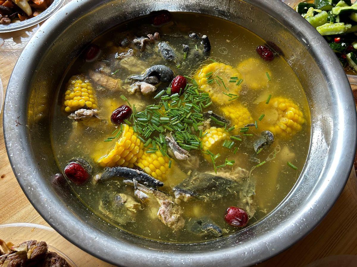 【山泉水土雞湯】用土雞煲湯,是婆婆家的一貫做法。自家養的土雞,加上甘甜的山泉水,簡單一煮,雞肉好喫有嚼勁,雞湯鮮美無比。煲雞湯的時候放一點玉米,孩子超喜歡,唯一不足的就是雞肉煮的時候沒有焯水,稍微油了一點點,喝湯的時候得撇一下油。