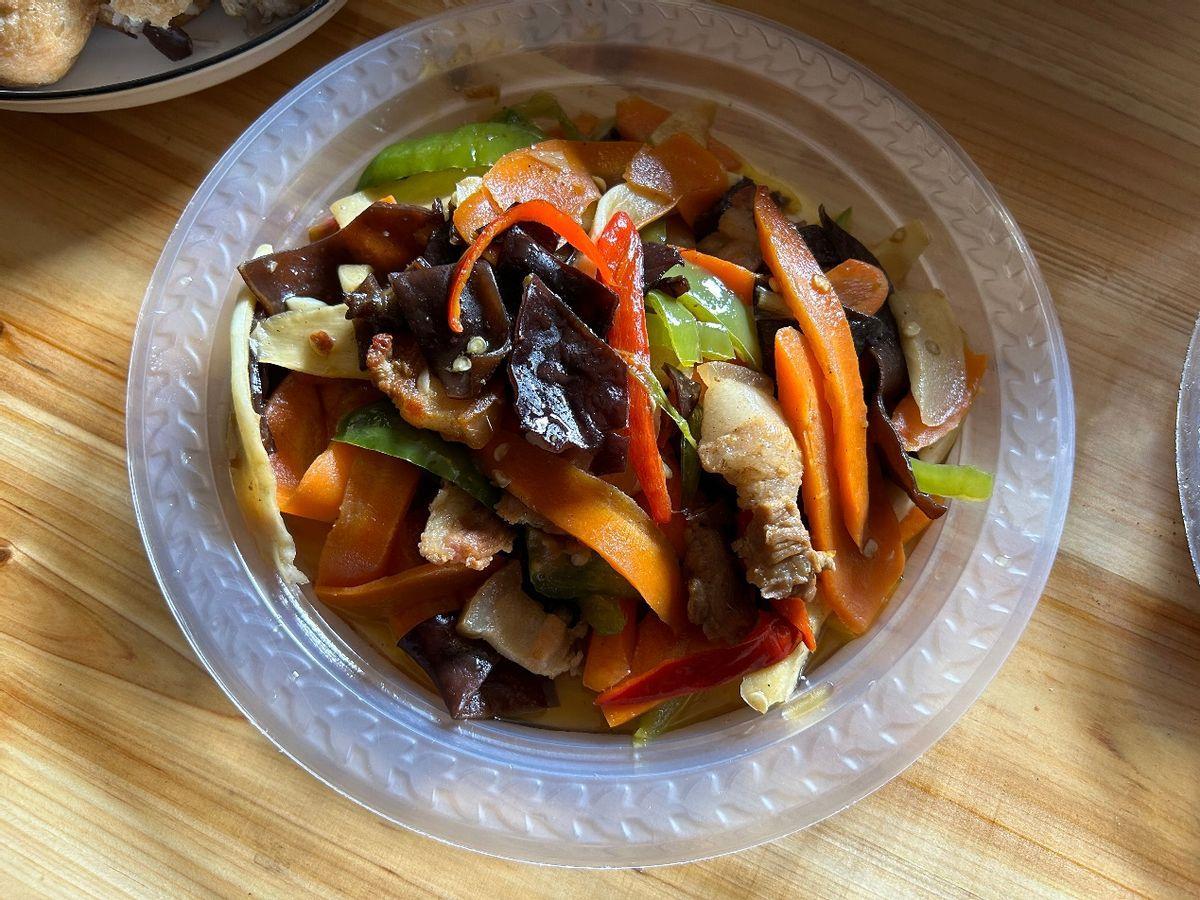 【胡蘿蔔木耳炒肉片】就着家裏的食材做的小炒,橙色的胡蘿蔔搭配黑色的木耳,綠色的青椒,色彩上看起來特別有食慾,搭配醃過的肉片,喫起來很爽口。