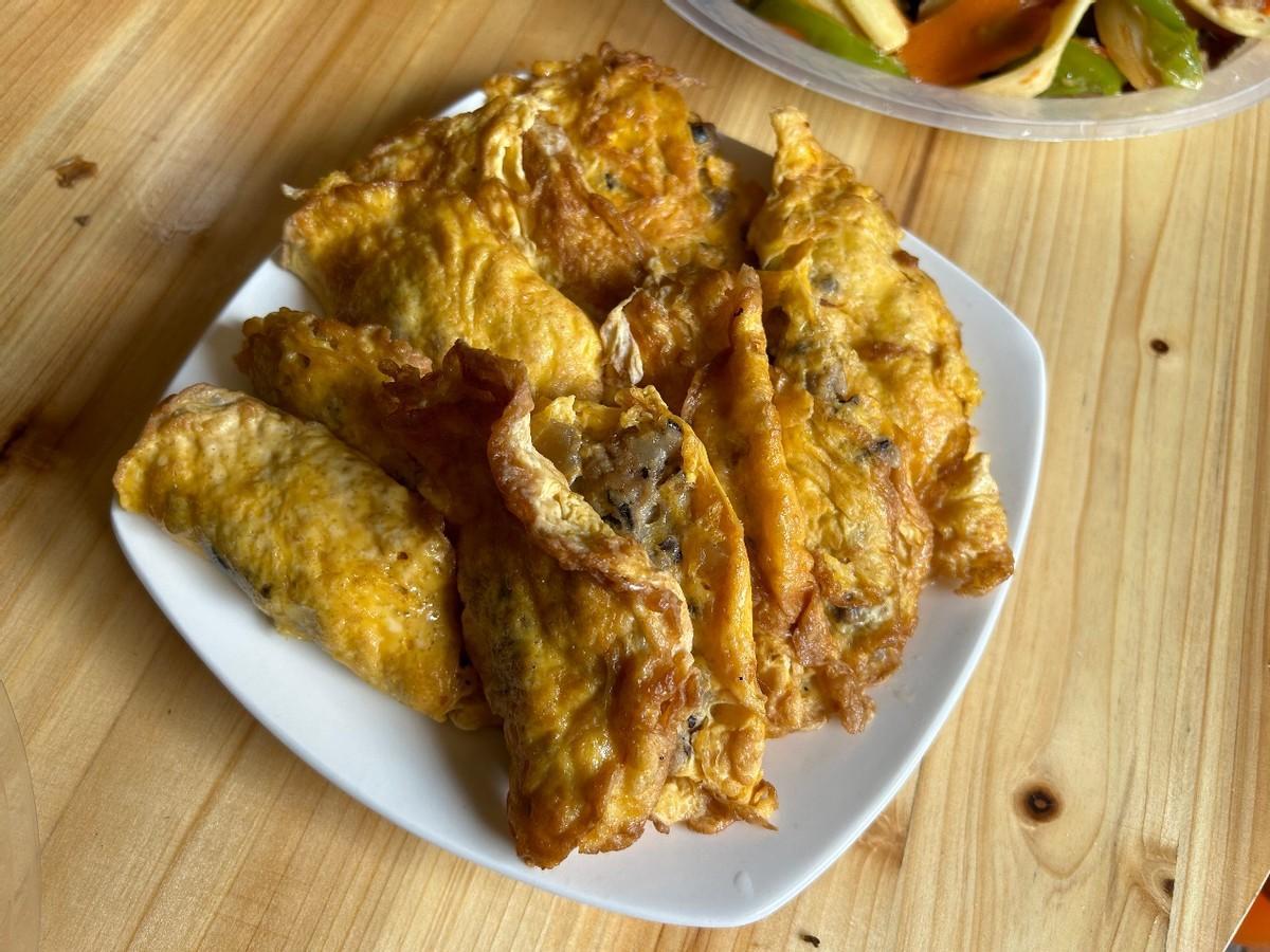 【黃金蛋黃】這個菜也是婆婆家的保留項目,雞蛋也是自家產的土雞蛋,色澤金黃,裏面包裹了一大塊加了木耳的肉餡。蒸熟後當小喫或者燙火鍋喫都很美味。這道菜雖然賣相不佳,不過味道確實不錯。