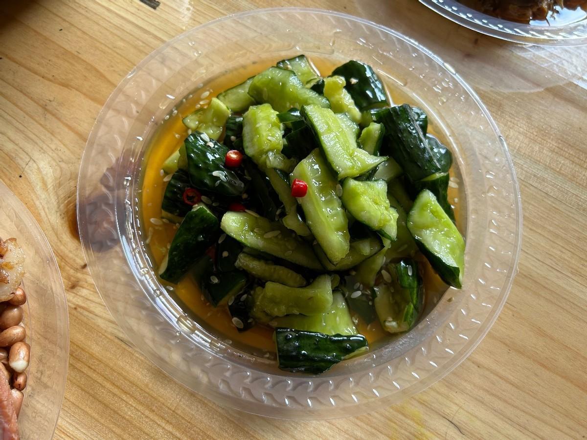 【涼拌拍黃瓜】每次家裏過節,我都會幫忙打打下手,這盤涼拌拍黃瓜就是我做的。本地剛出的新鮮黃瓜,用鹽閹出一些水分,搭配一點小米椒,淋上米醋,撒上白砂糖,拌勻後醃製10分鐘,酸甜中略帶一點辣味,喫起來特開胃。