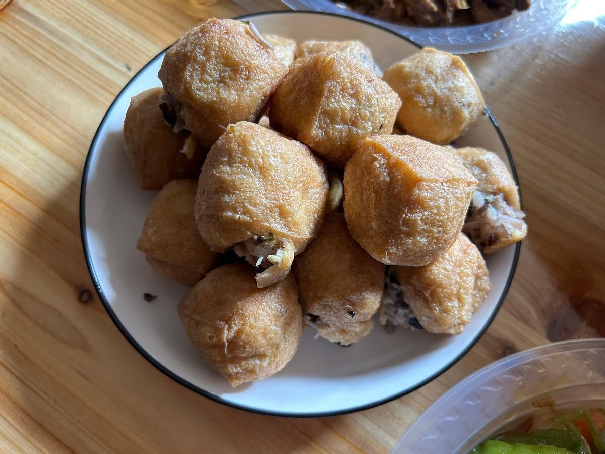【釀豆腐】逢年過節,桂林人必喫的釀菜之一。把肉餡釀到炸好的油豆腐裏,蒸熟後就可以上桌,它跟黃金蛋餃一樣,既可以當小喫,也可以燙到雞湯裏,二次加熱再喫。婆婆每次都會做很多釀豆腐,一部分現喫,一部分放冰箱冷凍,讓同事們帶回家,想喫的時候回鍋熱一下就可以開喫。
