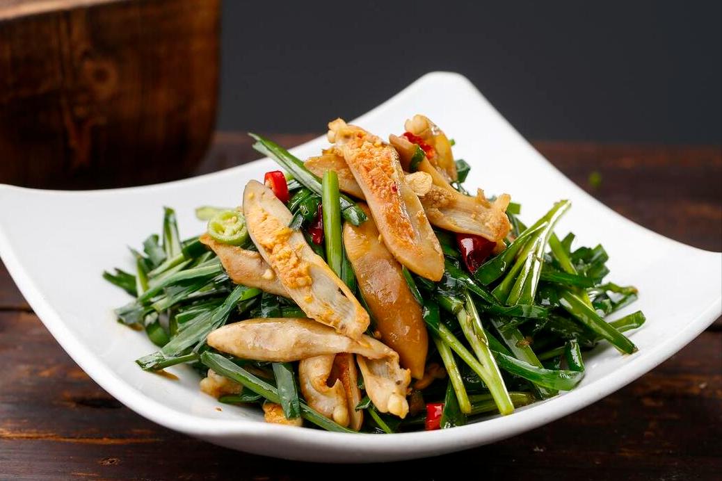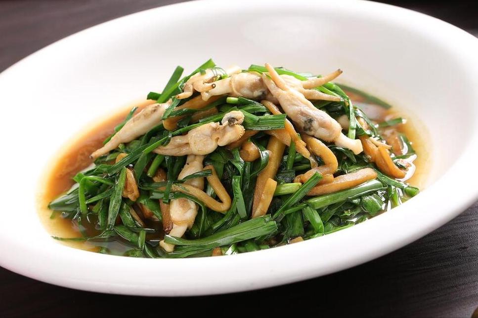 韭菜洗淨切段,蟶子冷水下鍋,焯水到開口後撈出來,把蟶子肉取出來,沖洗乾淨備用。接下來起油鍋,燒熱後下入薑絲炒香,然後倒入蟶子肉,來點料酒去腥,翻炒兩下後再倒入韭菜,來點鹽調味,充分炒勻後出鍋。