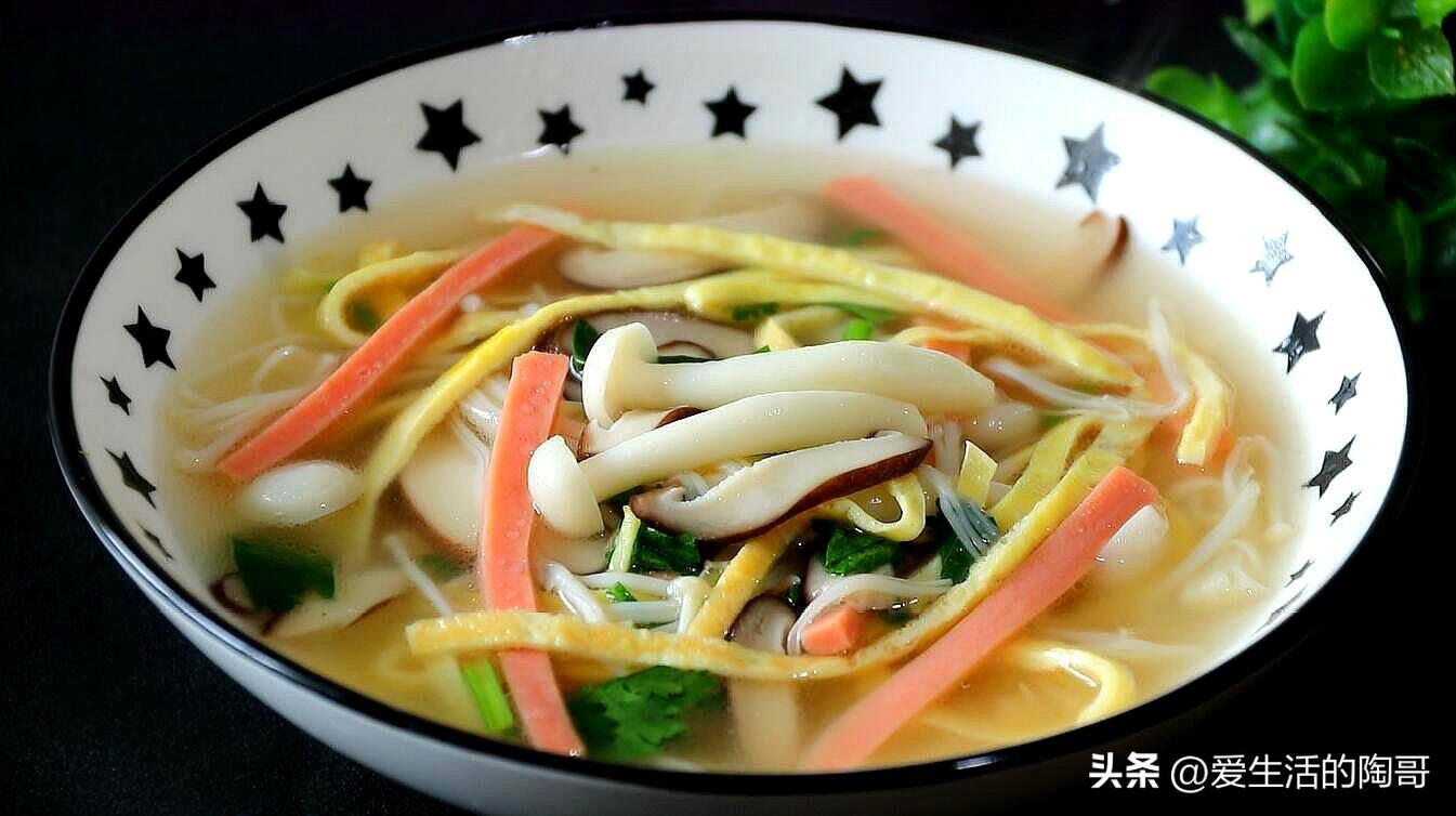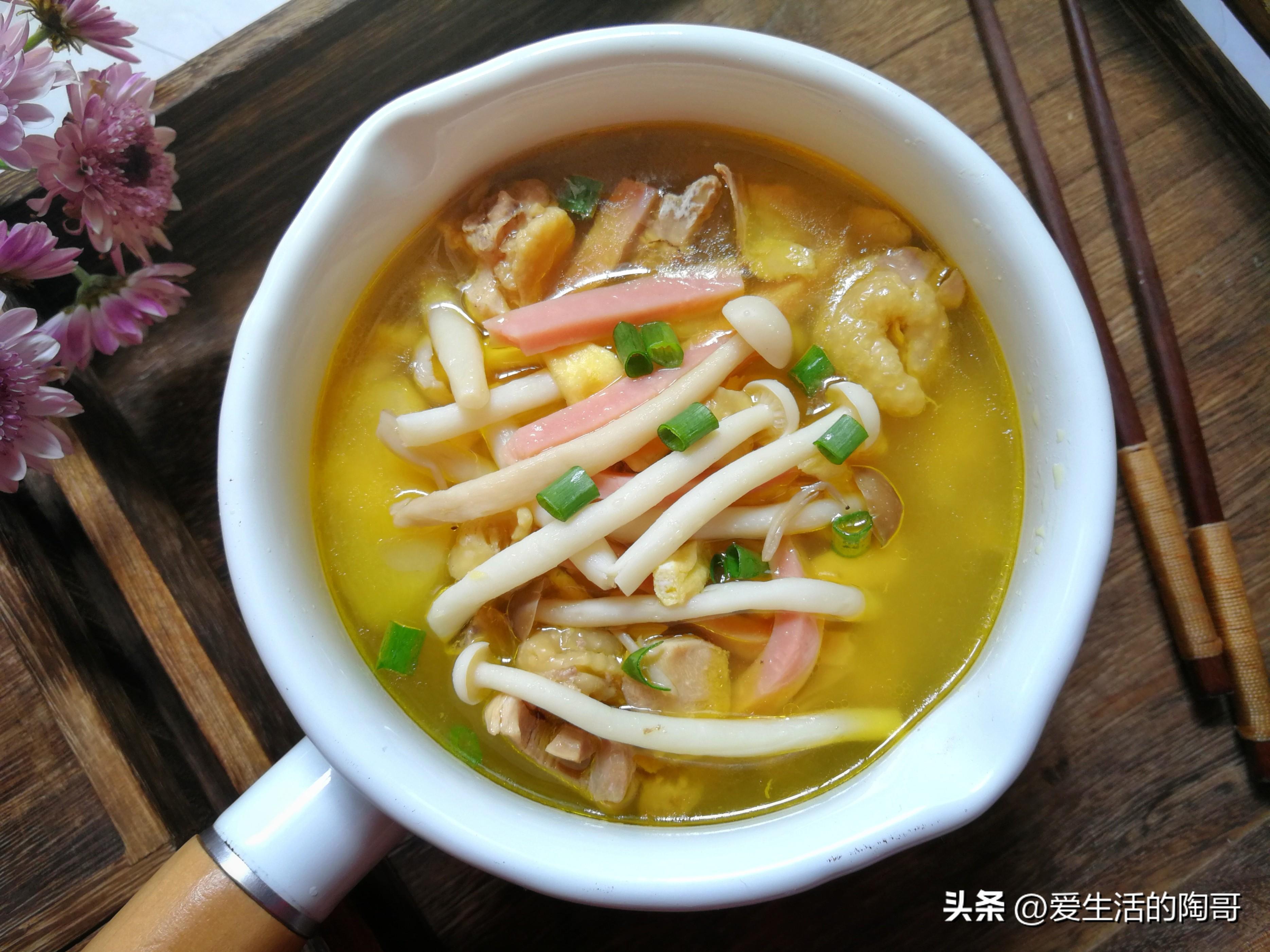 各種美食做好了,湯要搭配一個。喫飯不喝湯,味道少一半。用金針菇,蟹腿菇,搭配火腿等 一起做湯喝,既有營養又有口感。