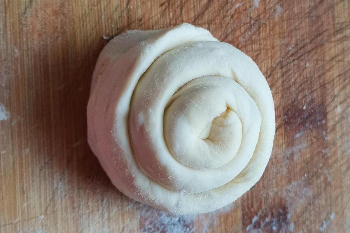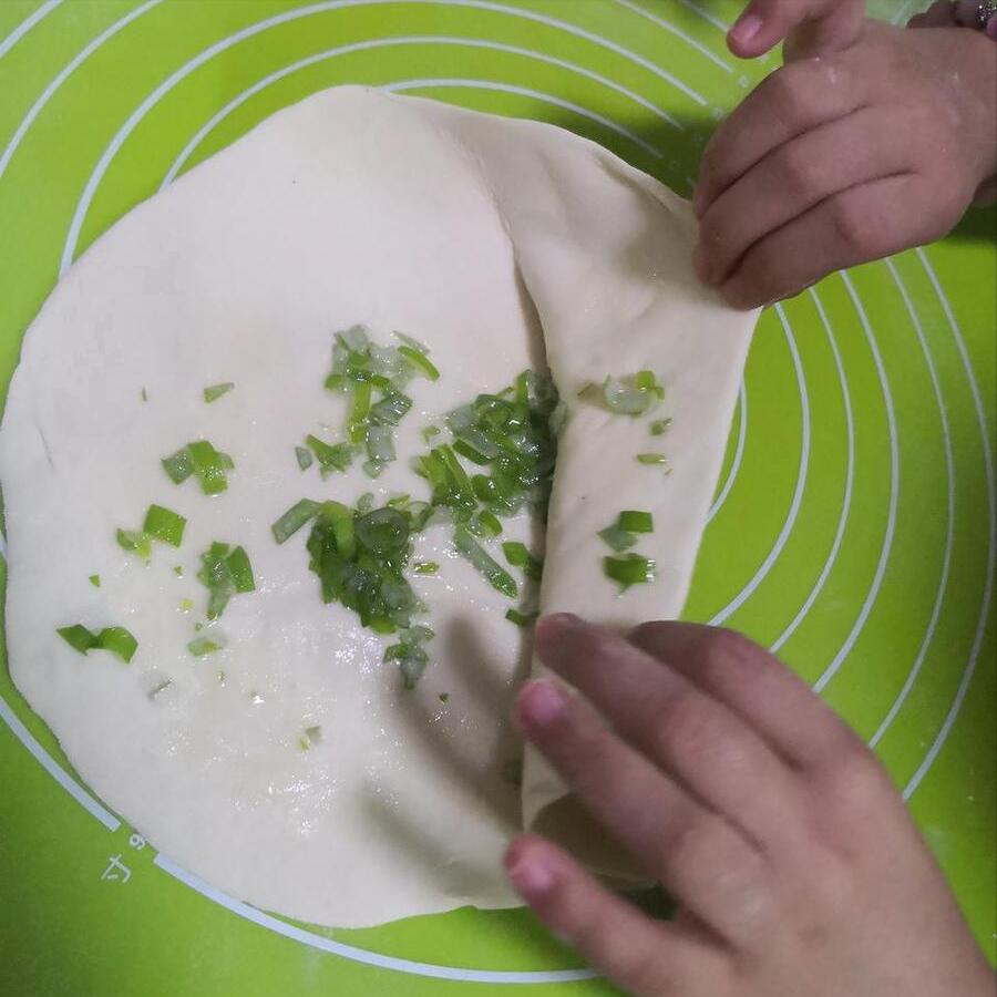 5、麪糰發酵好,拿出來放在案板上,將其揉一會兒,揉的更柔軟之後,分成幾個劑子,每一個都揉圓,用擀麪杖擀成麪皮,接着在上面刷上油酥,然後均勻的撒上蔥花,之後將其捲起來即可。