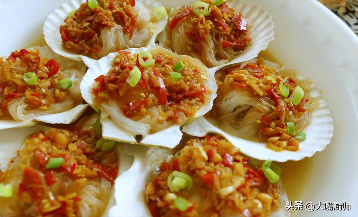 扇貝肉質鮮美,搭配蒜蓉蒸制,口感細膩且帶有絲絲蒜香。製作時,將扇貝清洗乾淨,去除沙囊,擺放在盤中。