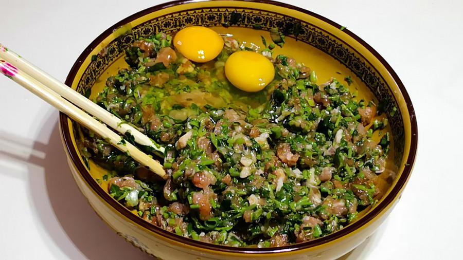 【香椿餃子】洗淨的香椿先焯水,然後瀝乾水分後剁成末備用;豬肉剁成肉餡,剁好後加入適量的鹽、生抽、味精、少許花椒油順着一個方向攪打均勻後醃製15分鐘;醃製好的肉餡中放入香椿末,加入適量的熟油,攪拌均勻後再磕入2個雞蛋,再次攪拌均勻後餡就調好了。