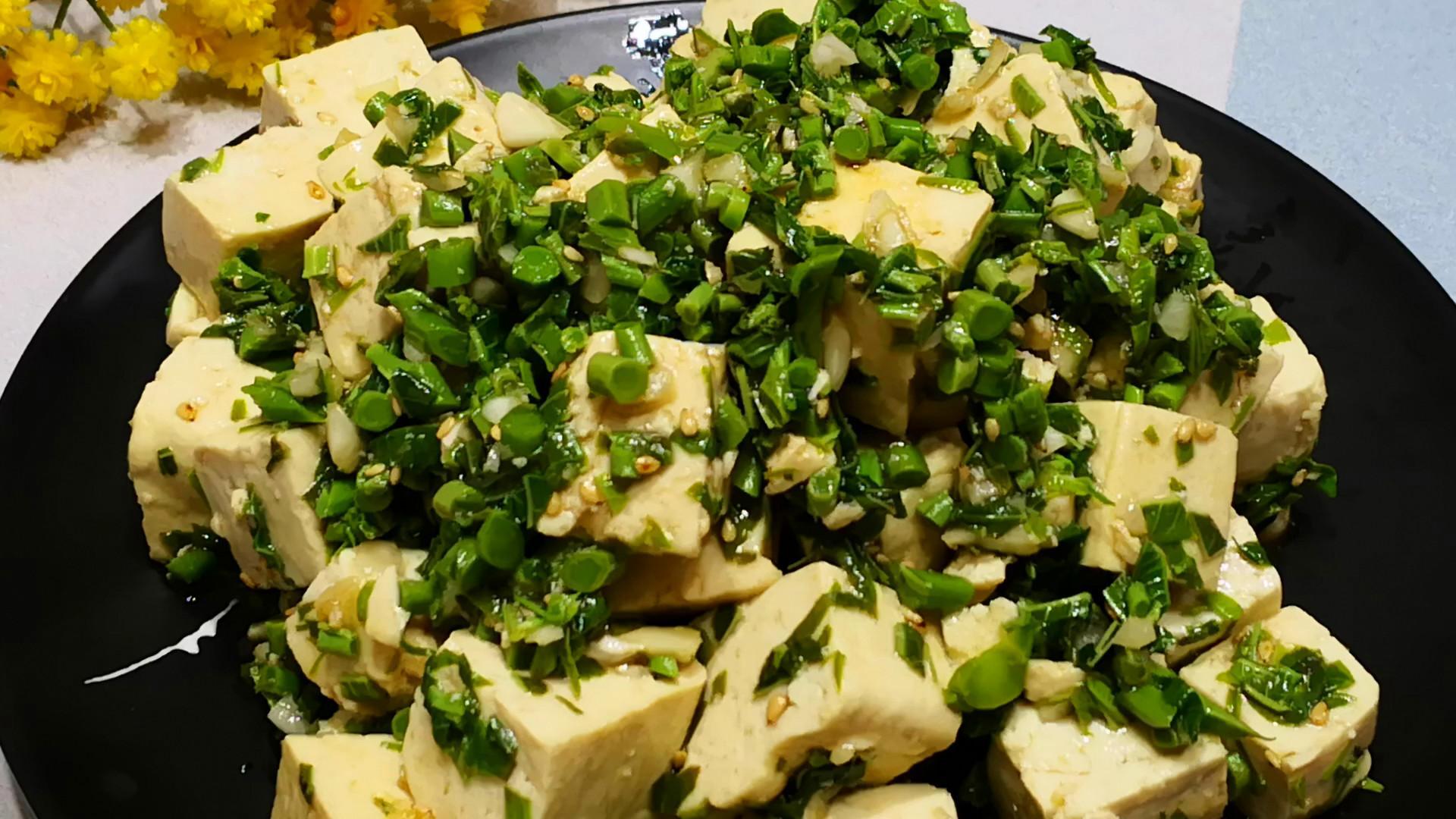 【涼拌香椿】香椿焯水後切細備用,取一塊老豆腐切成2公分見方的小塊;大蒜適量剁成蒜末,然後將蒜末放入香椿中,再加入一勺白芝麻,淋入燒開的熱油,激發出蒜和芝麻的香味,接着放入豆腐,然後開始調味:加入一勺鹽、一勺白糖、淋入少許香油、加入一點味極鮮,攪拌均勻後裝盤即可。