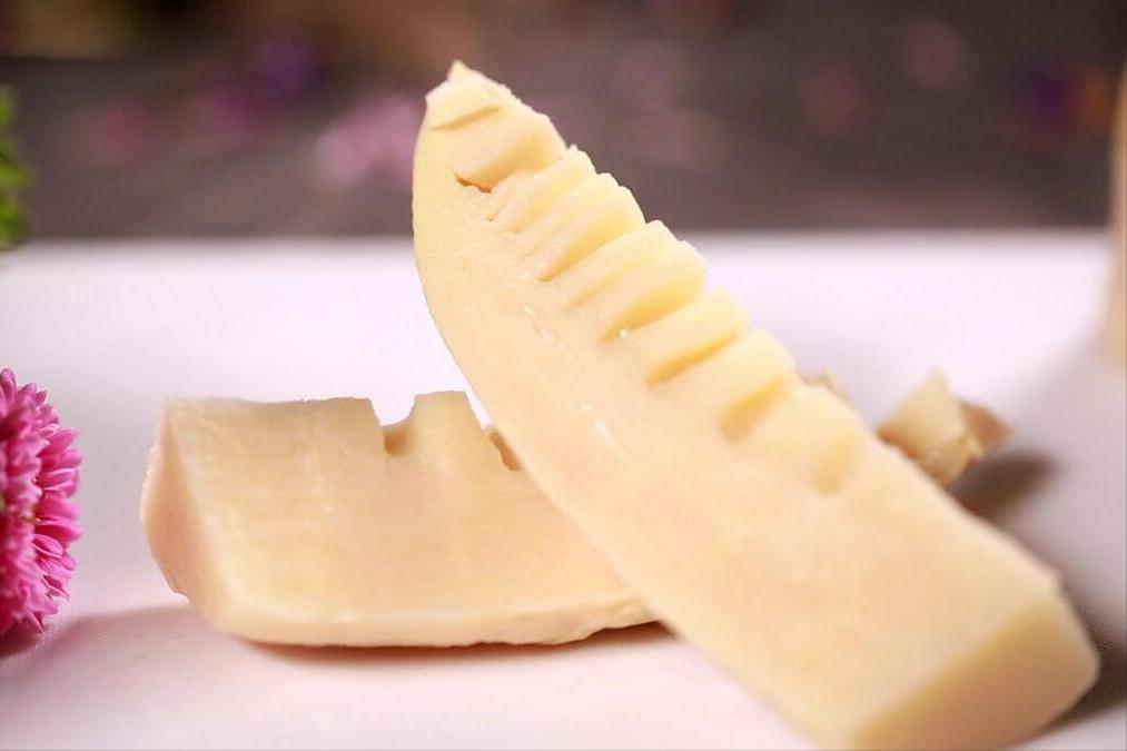 1、準備一些竹筍,春天就用春筍就行,正是最嫩的時候,把春筍外面的皮剝掉,只要是硬硬的部分都去掉,只留下最嫩的芯。