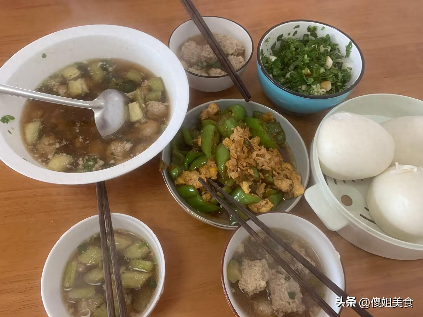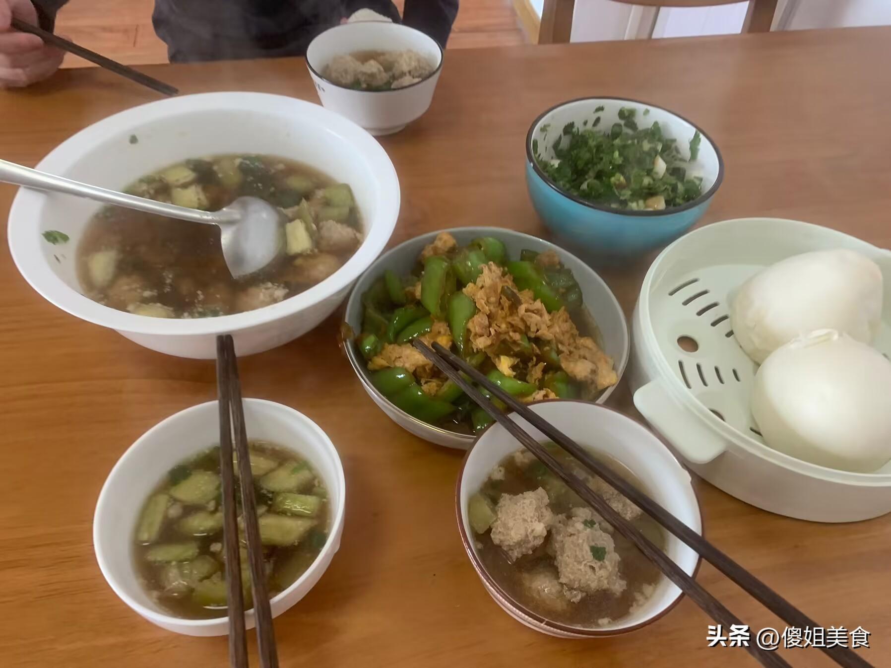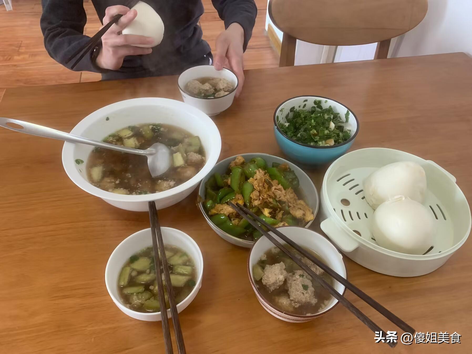 還簡單拌了一個涼菜,用香菜、香蔥切碎後,放入陳醋、蠔油、香油簡單一拌超下飯。午飯準備好端上桌,老公幫忙拿筷子、端饅頭,我把丸子湯盛入碗內,開始喫飯。