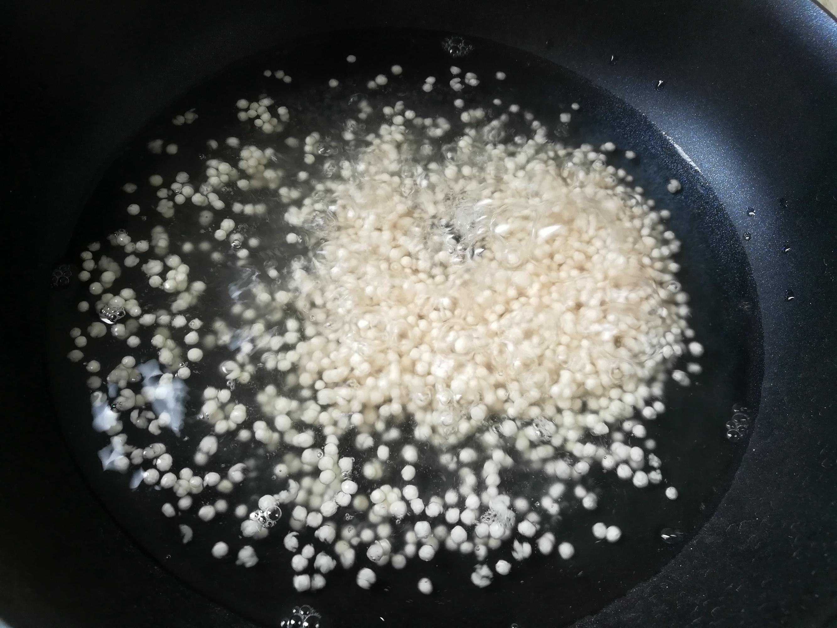 煮好的西米用涼水沖洗掉黏液,瀝乾水分。如果西米一次煮太多,記得放冰箱冷藏,變硬後加水煮到回溫,又會變軟了。