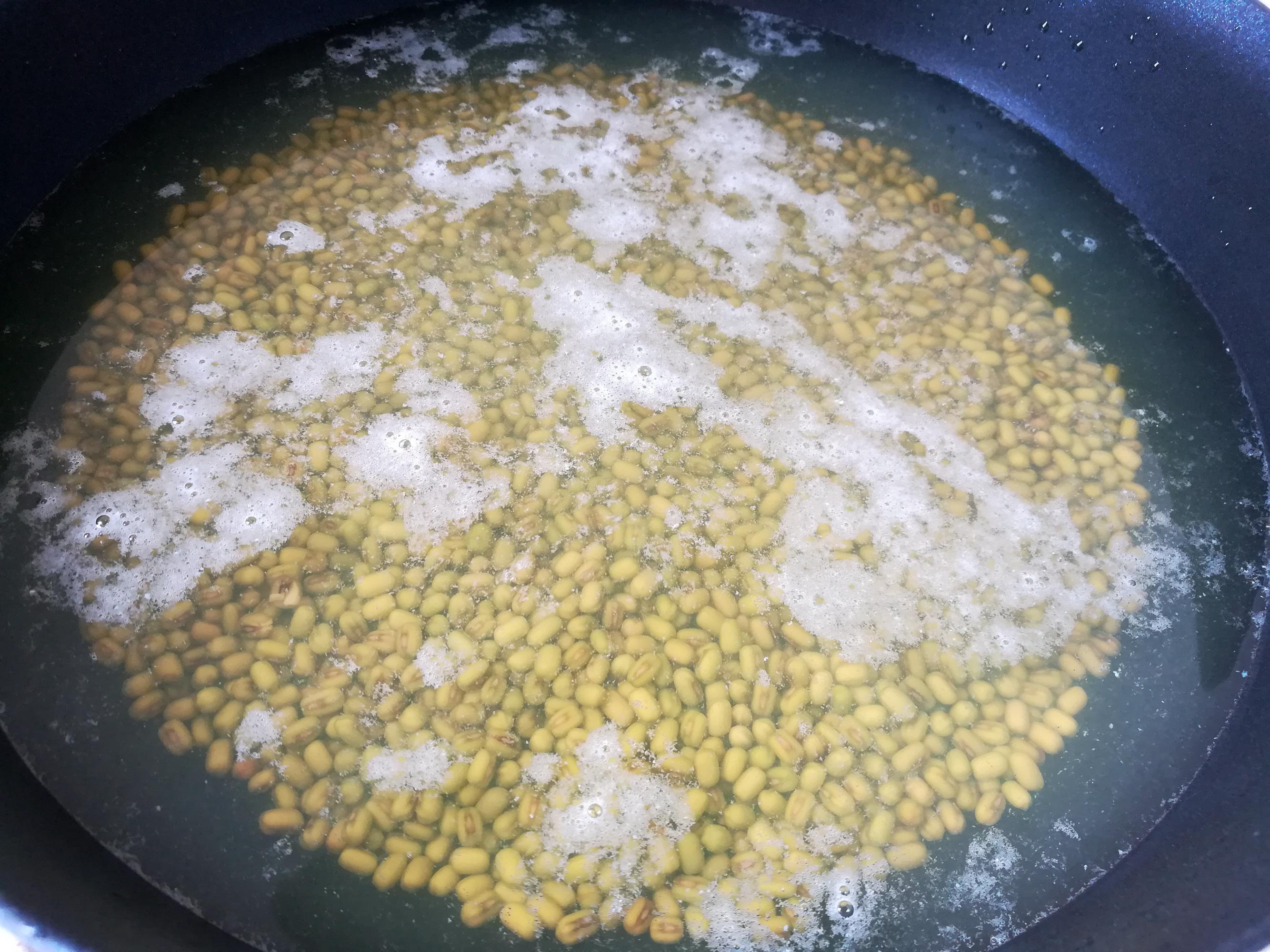 綠豆放入鍋中,加足量的水,大火燒開再煮5分鐘,這樣可以去掉綠豆的豆腥味。