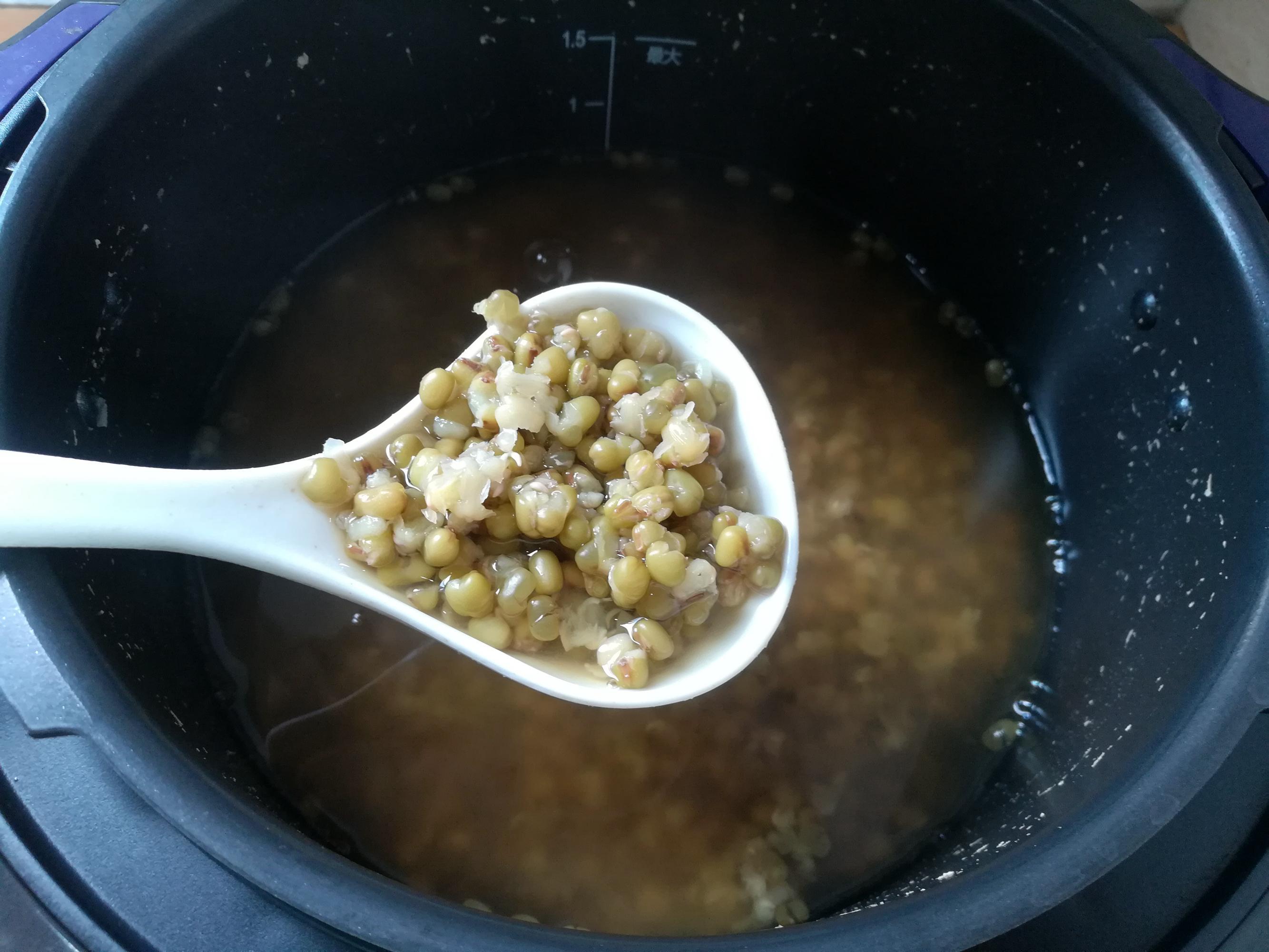 煮過的綠豆再次清洗乾淨,放入電壓力鍋中,加適量的水,選擇煮粥程序,煮大約20分鐘,煮到綠豆開花,熟透後加入紅糖攪拌均勻。