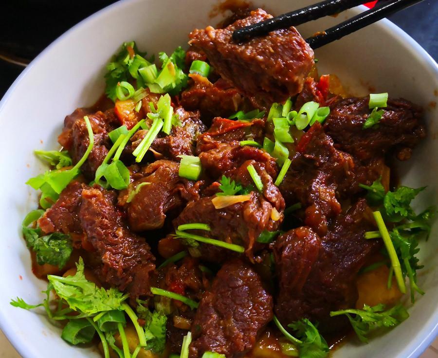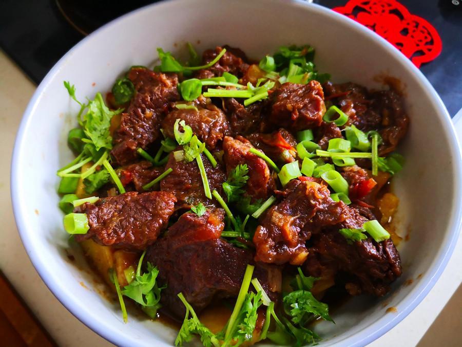 做這道菜,一般會選擇牛腩部分,這部分燉起來比較軟爛,適合於中老年人的牙口,牛肉先焯水,目的都是爲了去除牛肉的腥羶味,然後切成小塊;起鍋加油,放入花椒、八角、香葉、桂皮、蔥段和薑片,家裏如果有白芷,再加入一點白芷,去腥提香效果會更好,炒香後倒入牛肉塊,翻炒片刻後加入一勺黃豆醬、兩勺生抽、一勺料酒、適量的白糖、鹽和少許老抽,翻炒均勻後再倒入沒過牛肉的開水,燉20分鐘。