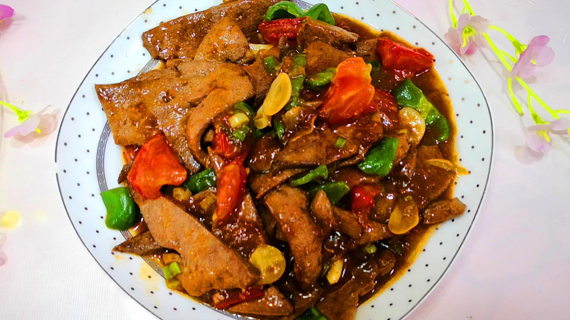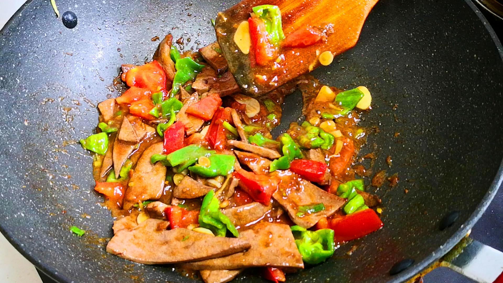 起鍋加油,油溫五成熱放入豬肝爆炒,炒至八成熟時加入蔥花、蒜片和薑絲,接着倒入調好的料汁,繼續翻炒片刻後,加入辣椒塊和西紅柿塊,炒至辣椒和西紅柿斷生後關火,然後裝盤即可。