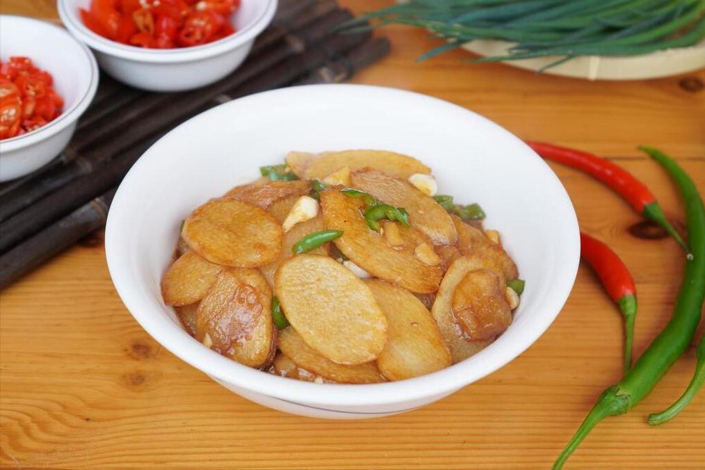 3、然後切成薄片,最後準備幾瓣大蒜,將其切片備用,這樣材料都準備完成後,就可以來炒了。炒鍋準備好,燒熱以後往裏面倒油,倒油再燒熱以後,放上切好的蒜片開始炒,炒到變色。