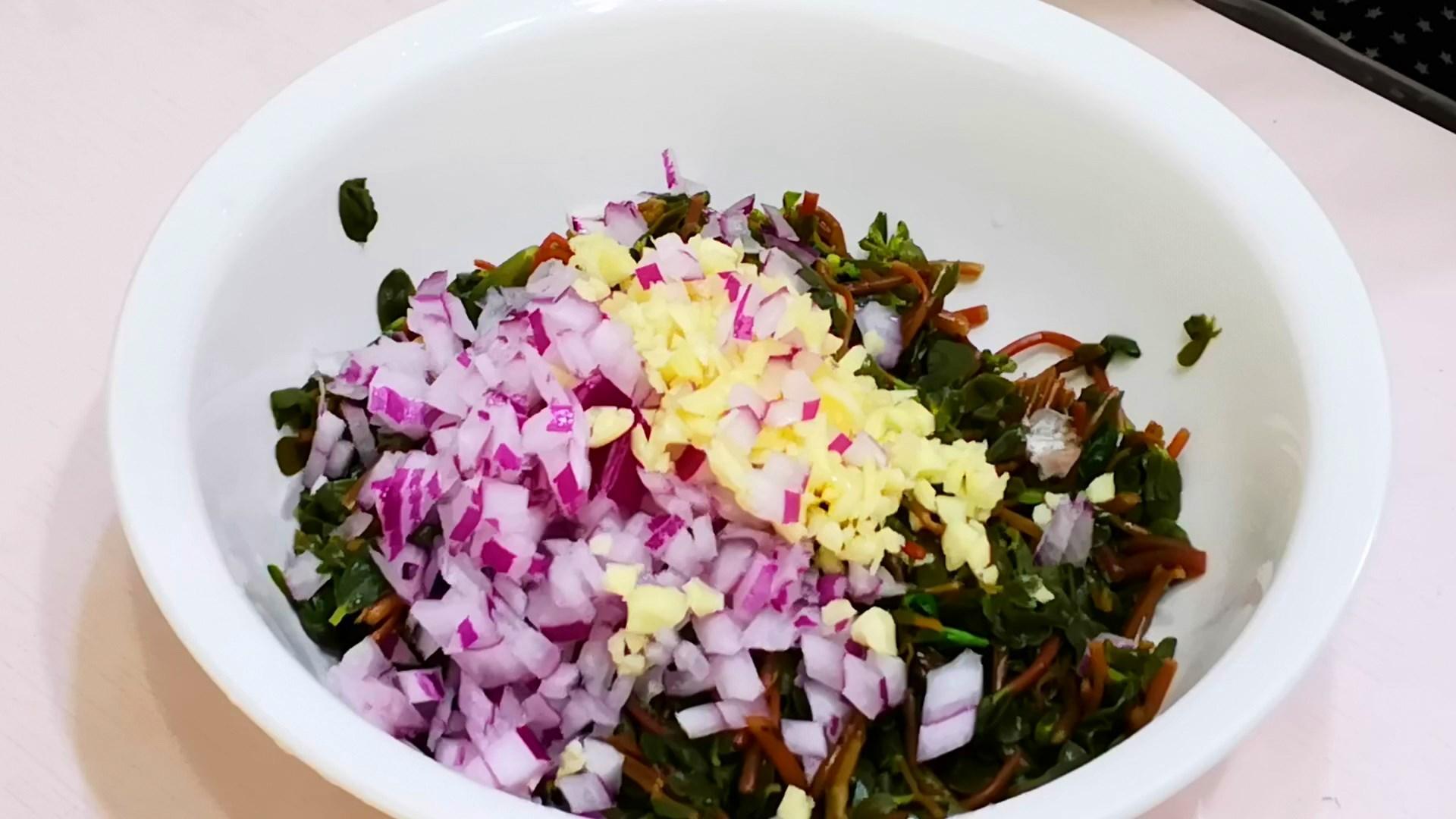 2.然後取半個洋蔥切成小塊後放入馬齒莧中。洋蔥脆甜的口感可以中和馬齒莧的酸味,另外還可以點綴顏色。