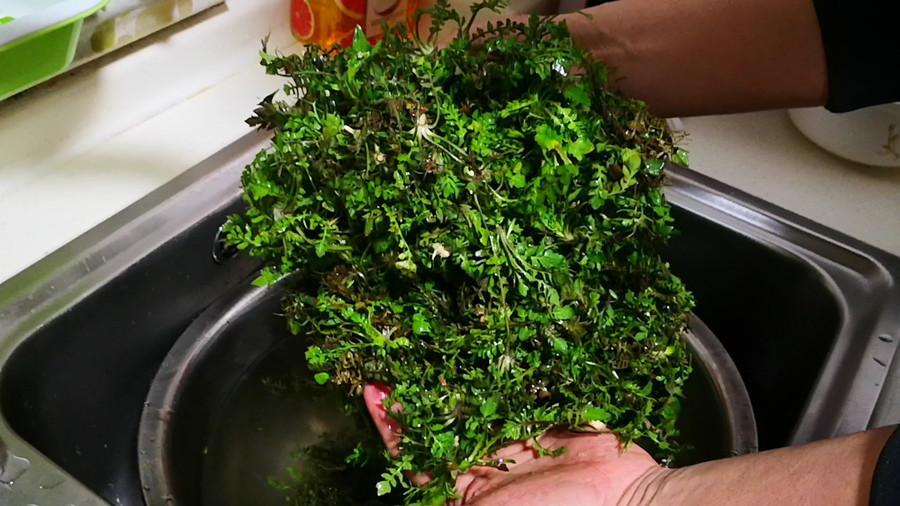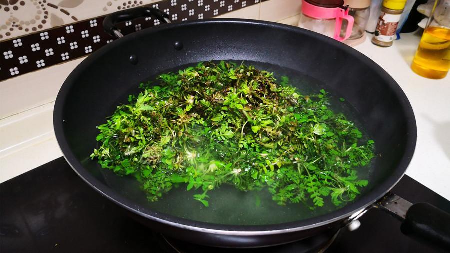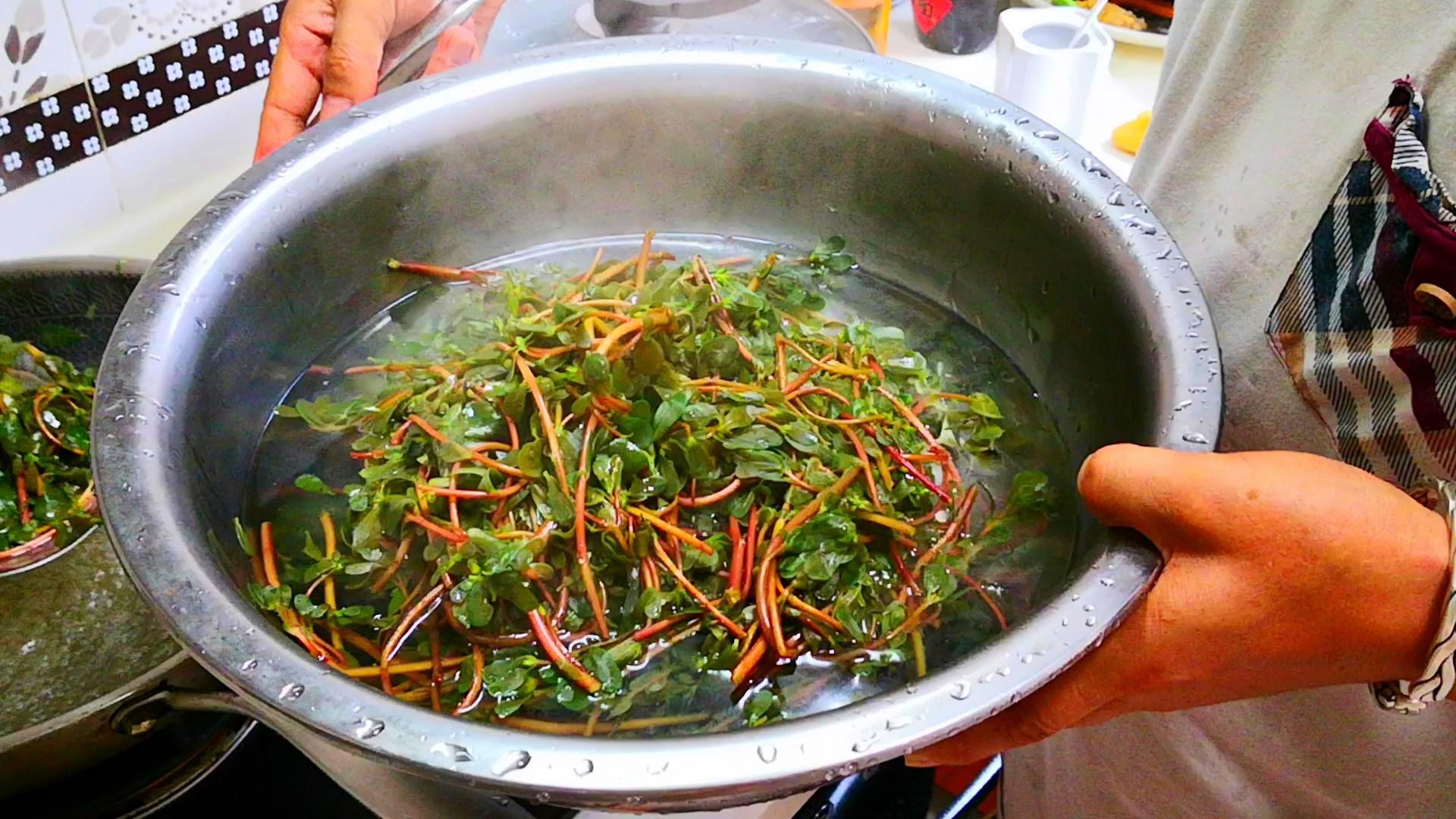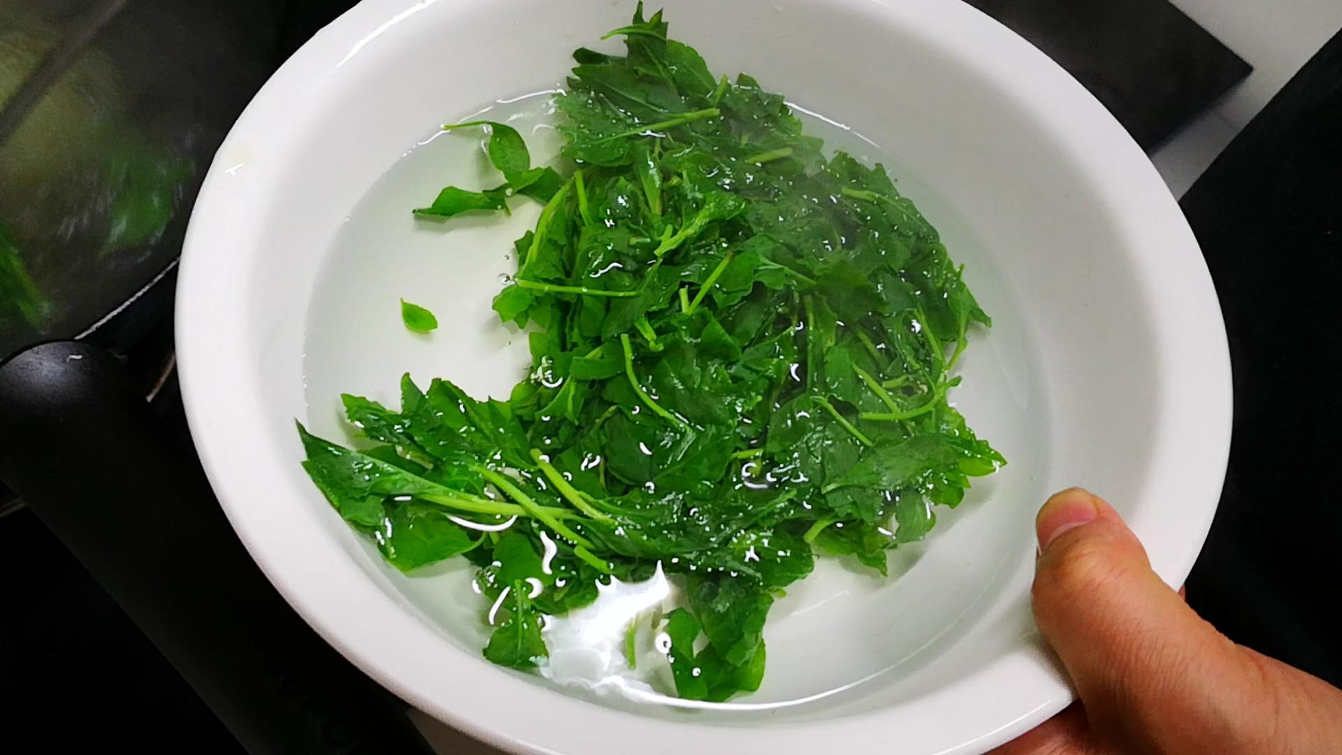 1.馬齒莧去掉老梗,洗淨後掐成寸段,燒一鍋開水,放入馬齒莧進行焯水,大約焯燙1分鐘左右後撈出馬齒莧迅速放到冷水中過涼,然後控幹水分後裝入碗中備用。馬齒莧含草酸,喫之前一定要先焯水。
