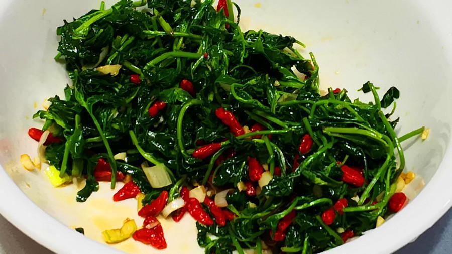 2.取一把枸杞洗淨,用溫水泡軟後撈出,放到焯水後的枸杞芽中。