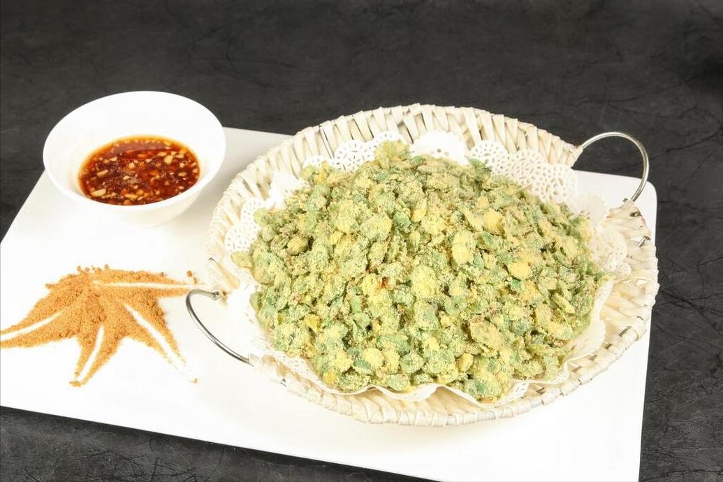 2、接下來往裏面少量多次的撒入乾麪粉,抓拌均勻以後,均勻的攤開鋪在籠屜中。鍋中提前燒水,等水徹底燒開後把榆錢放上去,蓋上蓋子蒸5分鐘出鍋。蒜末中加上鹽、香油、生抽、醋調味,拌勻後澆在榆錢上,開喫!