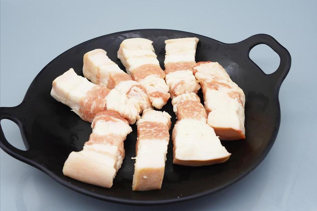 4、正確做法繼續往下看,將鍋子燒熱以後,千萬別往裏面倒油,而是需要直接將五花肉倒進去,乾鍋來翻炒。爲什麼紅燒肉很膩,就是沒有把裏面的油脂炒出來,這樣翻炒一下,油脂出來以後,就不會膩了,這是“做好的第2步”。