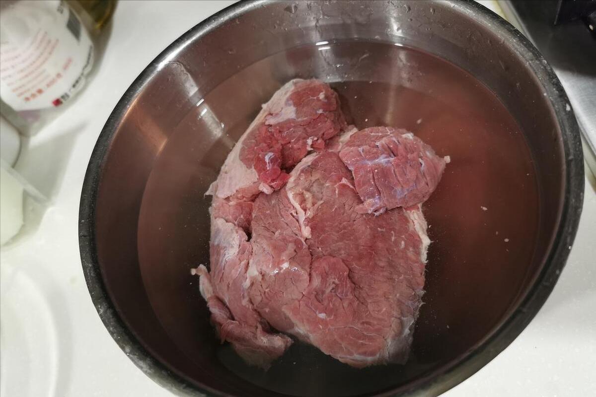 1、牛肉切成大塊以後,直接倒在水中,是不需要來焯水的,直接用水浸泡30分鐘以上,將血水泡出來,不僅沒有了腥味,而且變得更嫩了,浸泡就是第1個竅門。