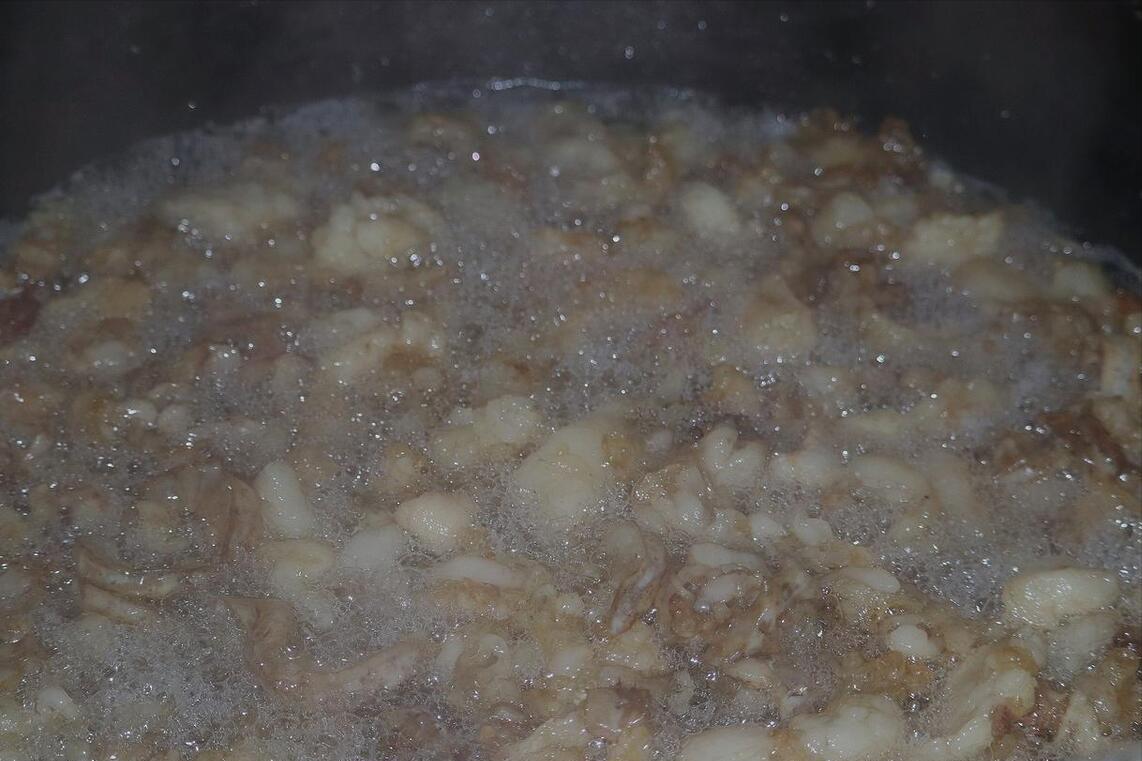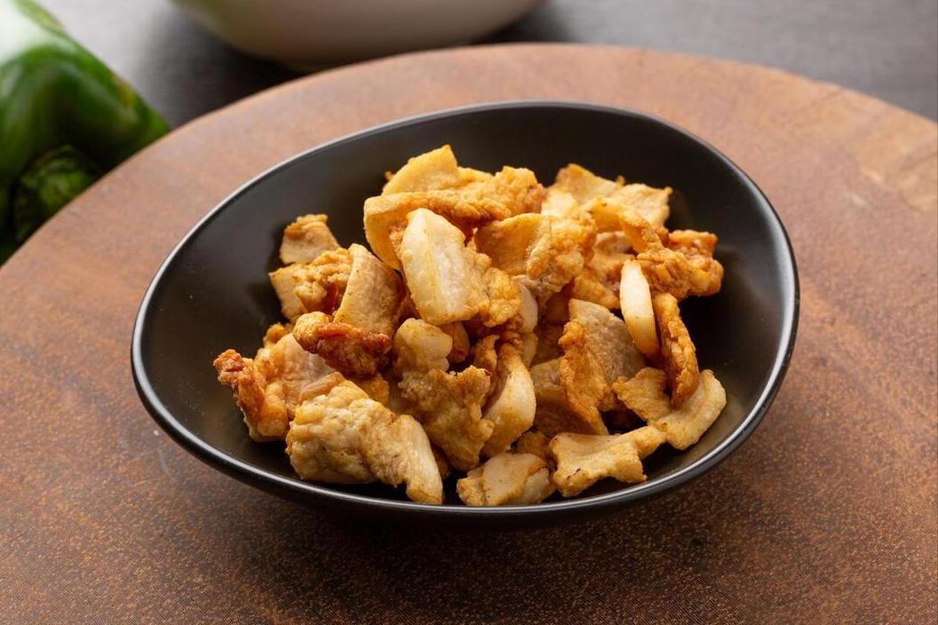 5、中途出油量太大的話,可以先把出來的油盛出來,然後繼續熬製,把豬板油中剩下的油熬出來,直至豬板油變得焦脆、金黃,這就成豬油渣的狀態了,這個狀態就不會再出油了,將其撈出來。
