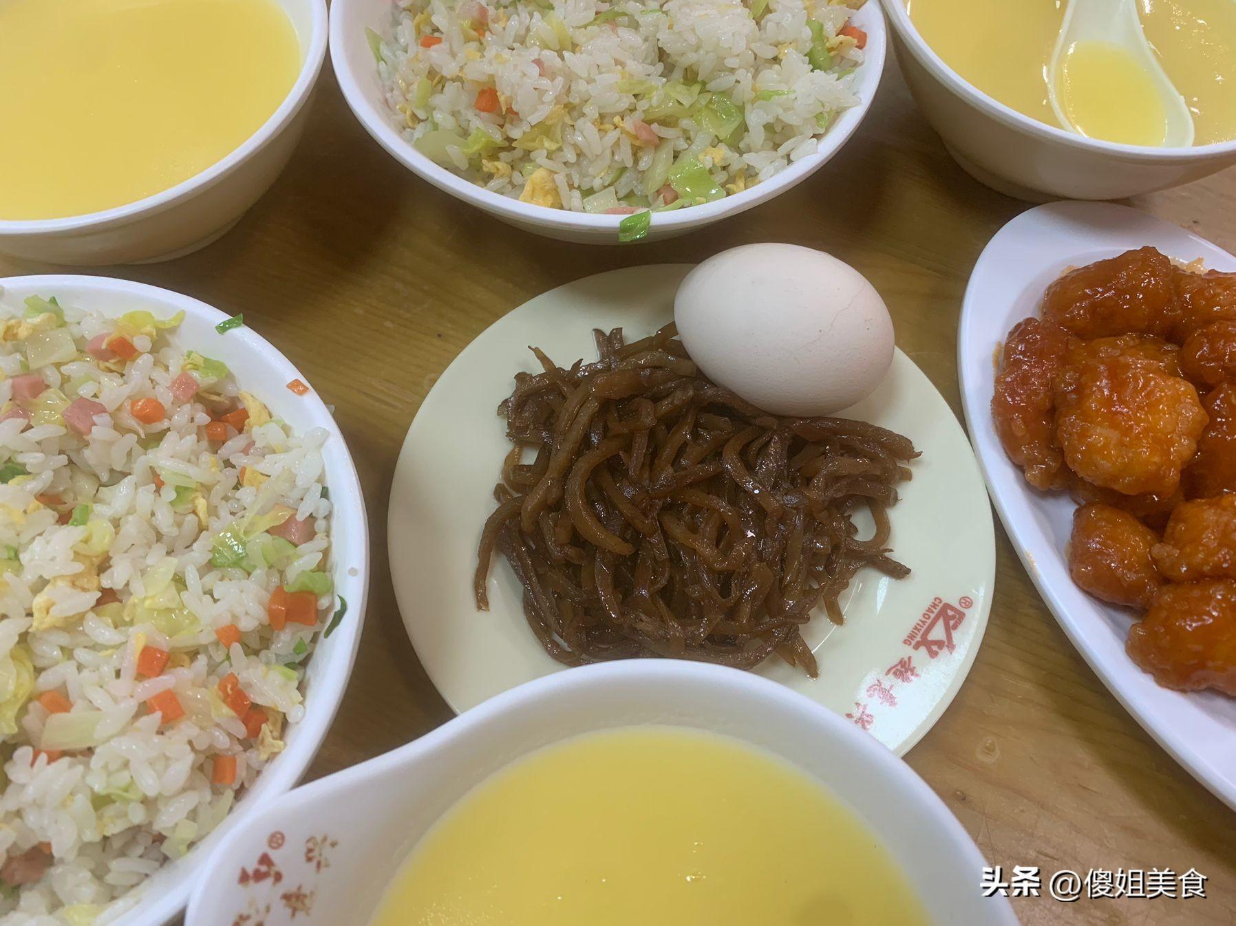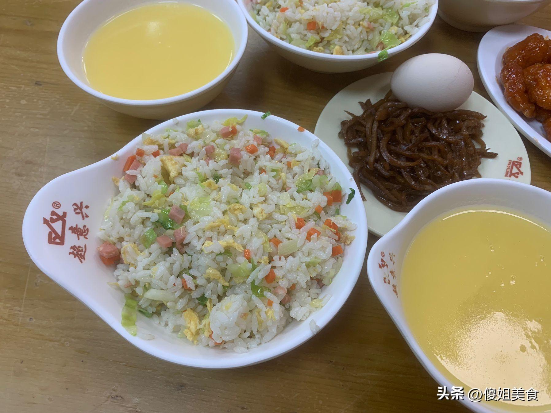 婆婆和兒子的口味差不多,都喜歡喫蛋炒飯,要了兩份米飯,3塊錢一份,份量還可以,一人一碗蠻能喫飽。早餐店炒的這個米飯就是好喫,裏面搭配的食材也好,雞蛋、圓白菜、胡蘿蔔和火腿腸,鮮香美味。兒子一碗沒喫下,剩下的一小部分我喫了,感覺味道不錯。