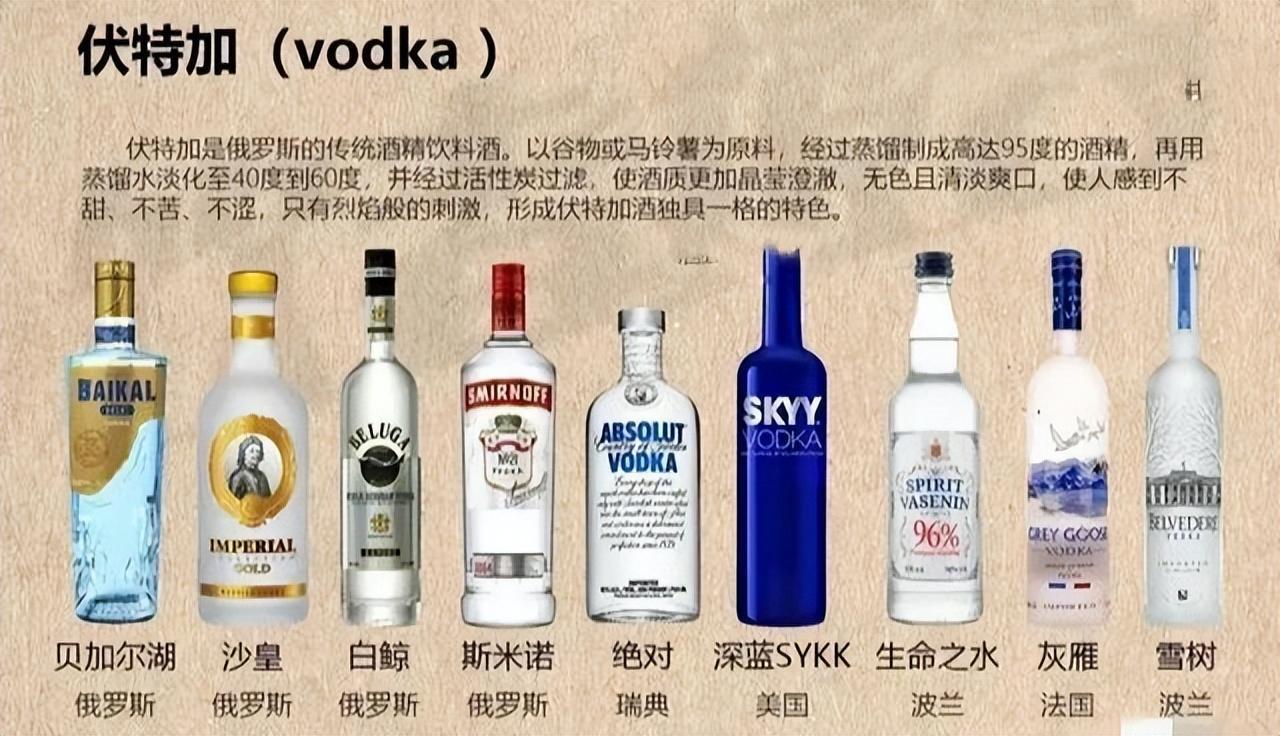 伏特加,俄羅斯的傳統名酒,度數最高的達到了95度,度數上遠遠超過白蘭地、威士忌等。該酒的釀製原料是各式各樣的穀物或者馬鈴薯,經過發酵、蒸餾、窖藏等可釀成。