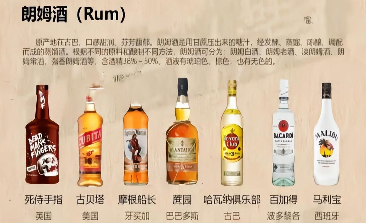 原料是並不常見的甘蔗,如今朗姆酒又有許多種類,諸如朗姆老酒、朗姆白酒、淡朗姆酒,其酒精度最低爲38度,最高的達到了60度,酒液區別較大有琥珀色、棕色、無色。