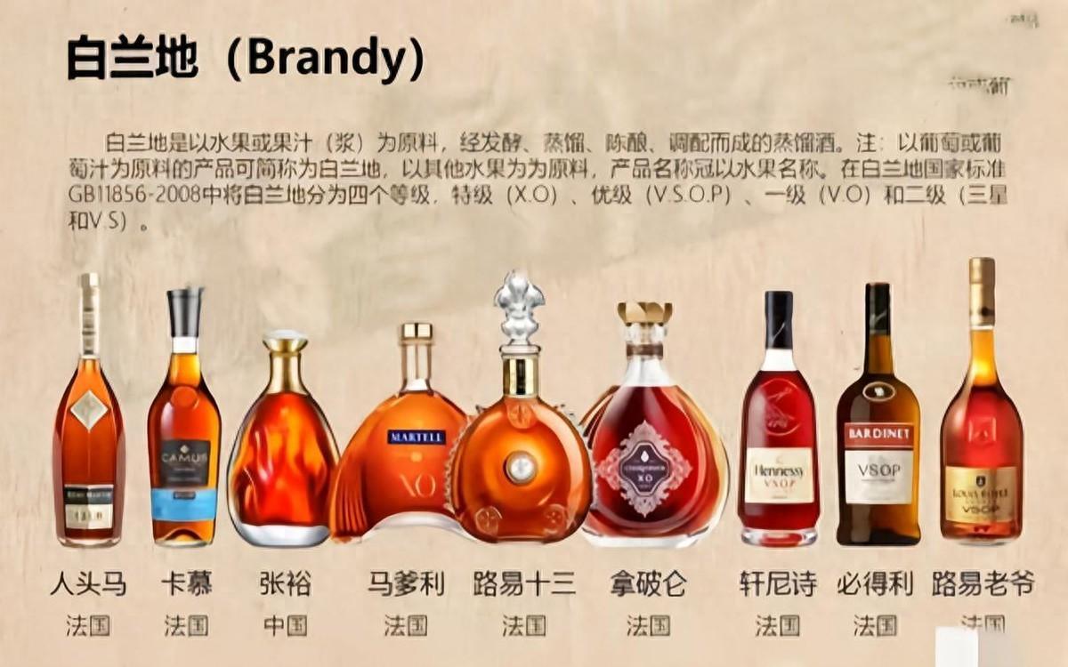 該酒最早產自法國,是世界著名酒水之一。白蘭地的釀酒原料和白酒有所不同,即種類繁多的水果或以這些水果榨出的果汁。工藝流程和白酒區別較大,複雜同時又耗時。