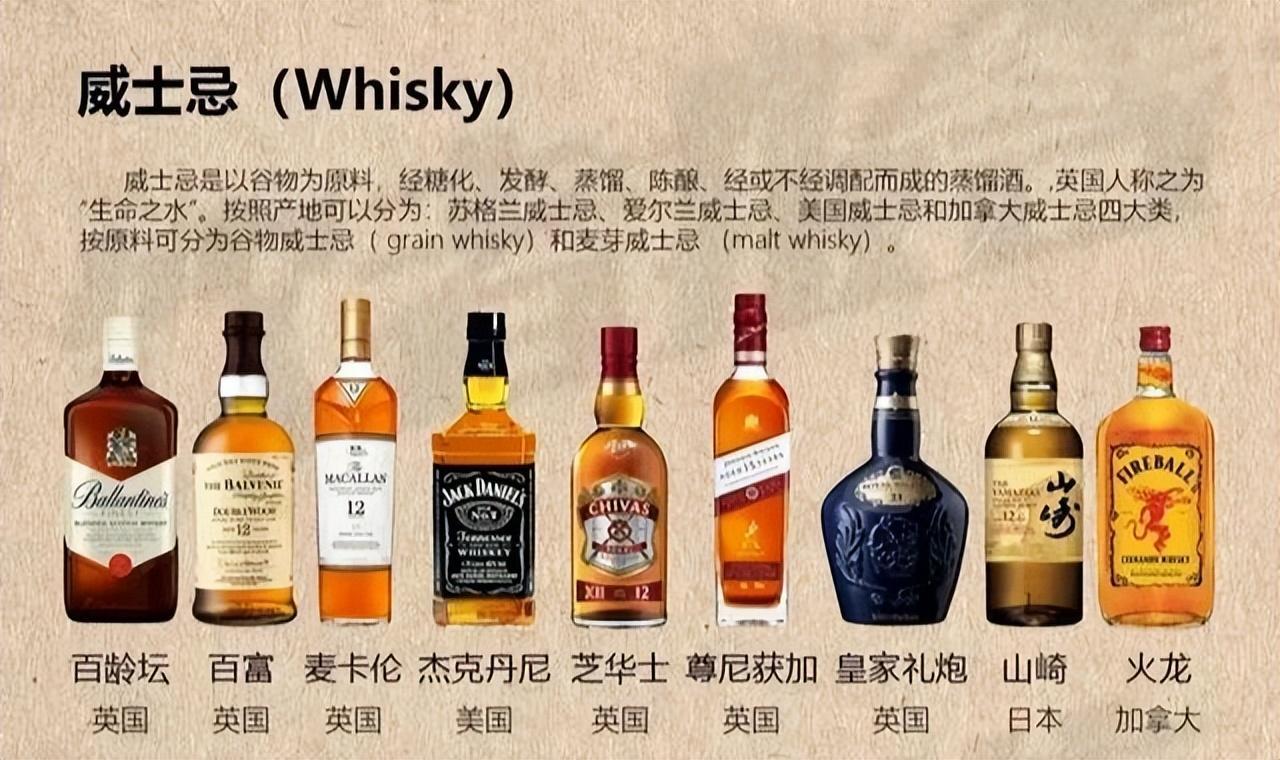 衆所周知,生產威士忌的國家較多,分別有英國、美國、加拿大、日本等,其中以英國居多。威士忌的釀製細節區別於白蘭地以及中國的白酒,它的原料是各式各樣的穀物。