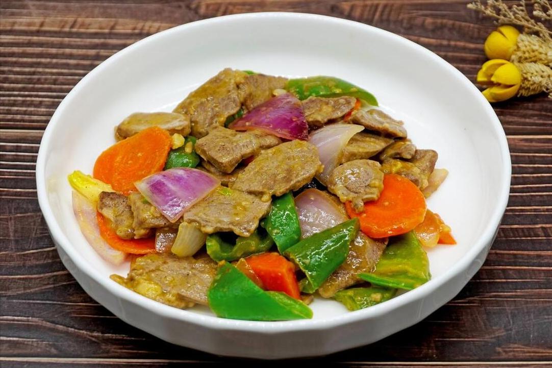 配料:青紅辣椒、洋蔥、蔥薑蒜、新鮮豬肝、白胡椒粉、食鹽、味精、料酒、生抽、老抽、蠔油、食用油