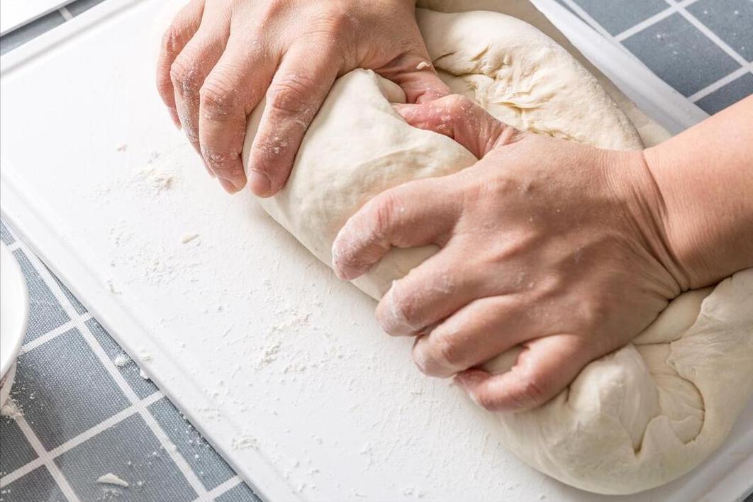 5、越暖和,發酵的速度就會越快,等麪糰變成蓬鬆的狀態,裏面一個一個的蜂窩時,即可取出來。拿出來以後放到案板上,提前在案板上撒上一層乾麪粉,然後開始不停的揉麪,讓裏面的空氣排幹。