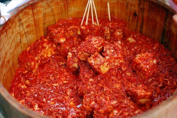 5、等豆腐完全冷卻後,先將其全部倒在白酒醪糟中,充分攪拌一下,保證豆腐的每一個面,都裹滿了纔行。然後夾起來,夾到辣椒麪這些調料中,使其裹上厚厚的一層,再準備一個罈子。