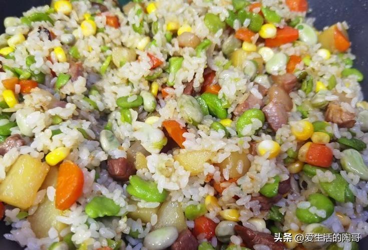 5選擇燜飯程序,來燜米飯即可。米飯燜熟後,打開蓋子,上面撒點蔥花,調味汁放進去,攪拌均勻,香香的蠶豆飯就做好了。