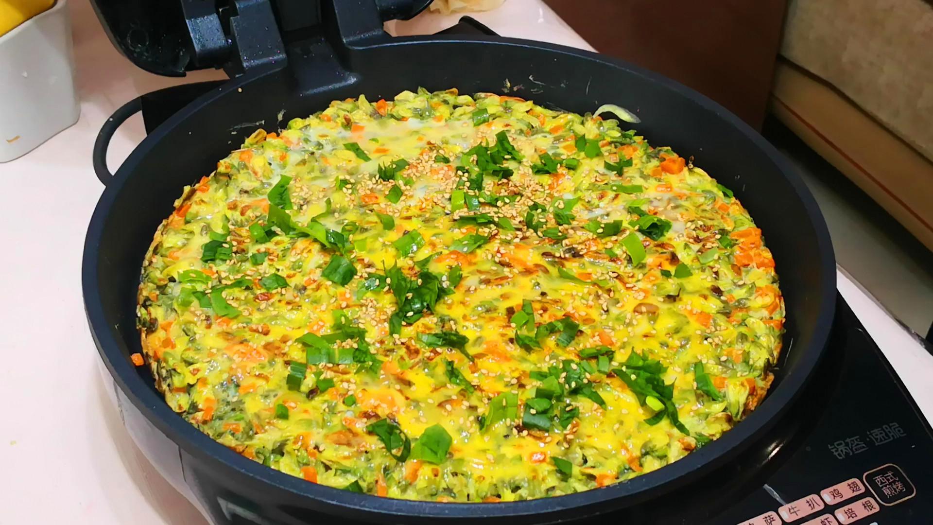 2.電餅鐺上下層預熱後,先把底層刷一層食用油,然後把調好的槐花雞蛋糊倒入鍋中,用鏟子推平後,再用油刷在餅的上面刷一層油,這樣烙好的餅暄軟好喫,接着蓋好鍋蓋按烙餅鍵開始烙制。