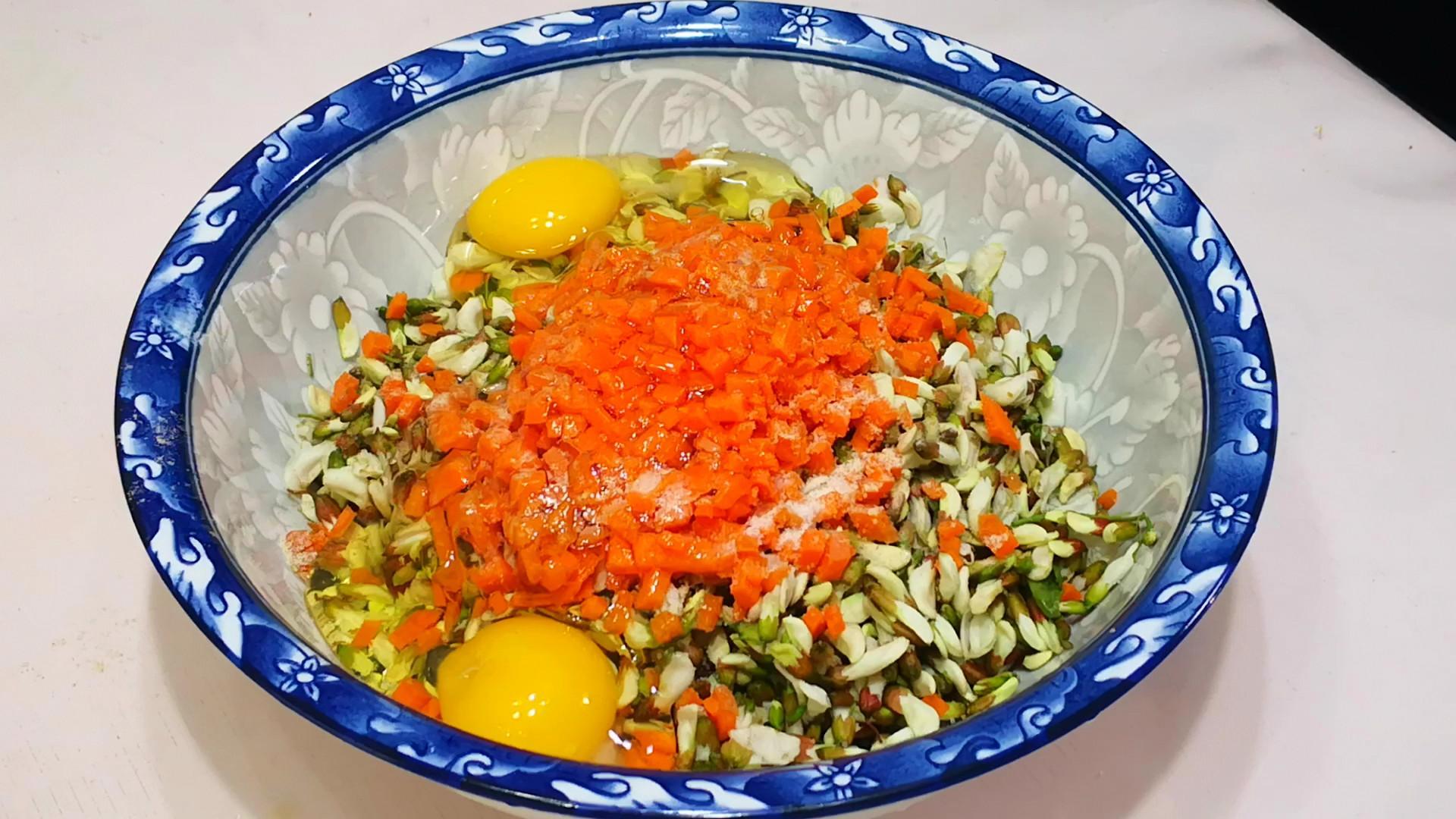 1.槐花洗淨後放入碗中,加入適量的蔥花和胡蘿蔔丁配色,然後再磕入2個雞蛋,加入一匙鹽和胡椒粉調味,攪拌均勻後再加少量的麪粉,攪拌成粘稠的糊狀即可。