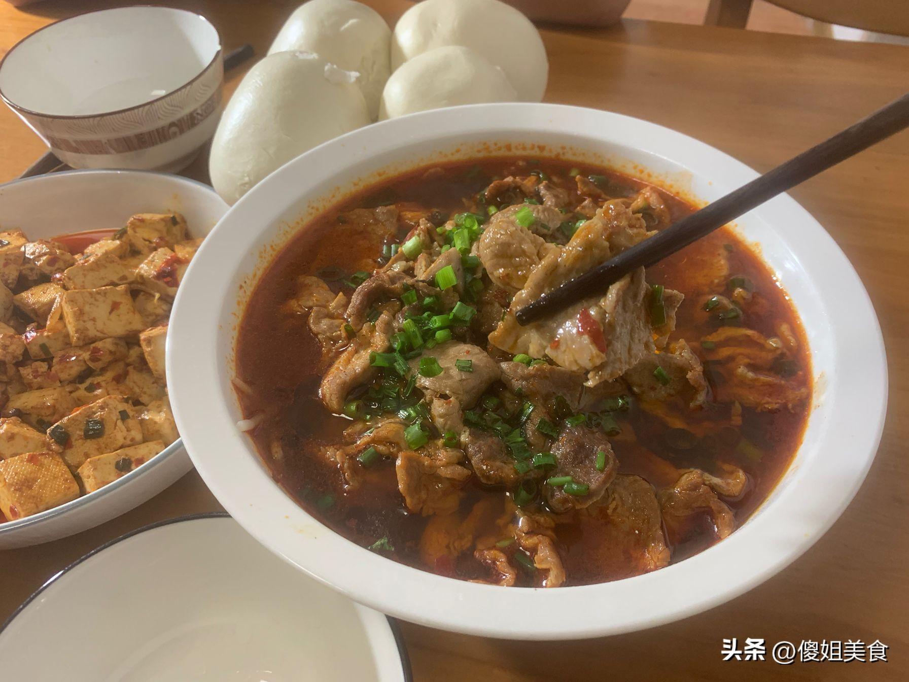 第二道菜是水煮肉片,看似很簡單的水煮肉片,每次做都做不好,這次終於做出了比飯店還要好喫的味道。我們都不喜歡喫肥瘦,我就買了一斤的精瘦肉,自己改到切成薄片,清洗乾淨後攥幹水分放入1小勺玉米澱粉、半個雞蛋清抓拌均勻,這樣肉片煮熟後滑嫩不柴。首先把需要放入的青菜煮熟,我放的綠豆芽,煮熟後控幹水分撈入大碗內。另起鍋燒油放入火鍋底料炒出香辣味,放入1大碗清水煮之沸騰,把肉片丟入鍋中煮3-5分鐘,然後肉和湯汁都倒入盛有綠豆芽的碗內,上面撒上蔥花、幹辣椒段,用100度的熱油澆在上面,鹹辣入味,好喫又下飯,賊香。
