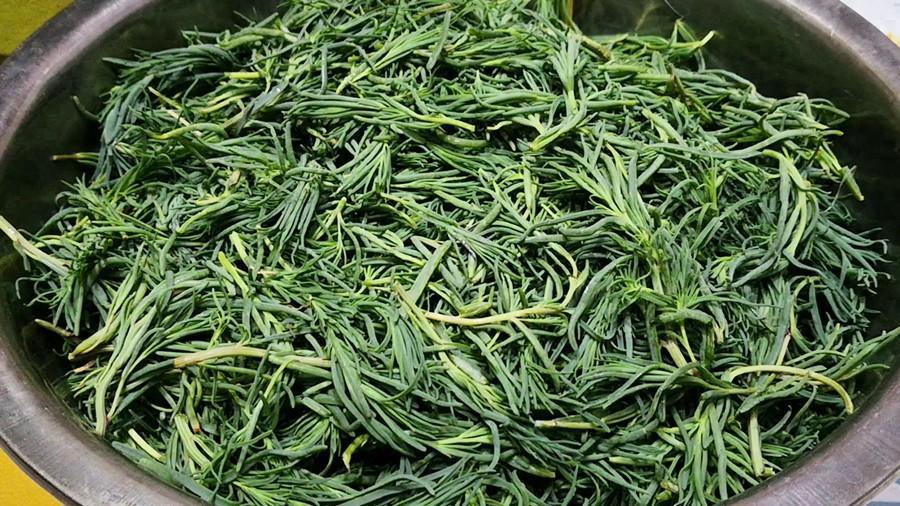 相比較三月的薺菜、苦菜,四月的香椿、麥蒿,五月的第一鮮非它莫屬,那就是黃鬚菜。黃鬚菜也叫翅鹼蓬、黃席菜、黃蓿菜、龍鬚菜等,它的生長環境比較特殊,生長在鹽鹼地、海邊沙地,也叫鹼蓬,被灘區人們親切地稱之爲“奉獻菜”,困難時期用以裹腹充飢,初夏最爲鮮美,到了秋天只能觀賞,變成紅豔豔的顏色,就像“紅地毯”一樣,尤爲壯觀!