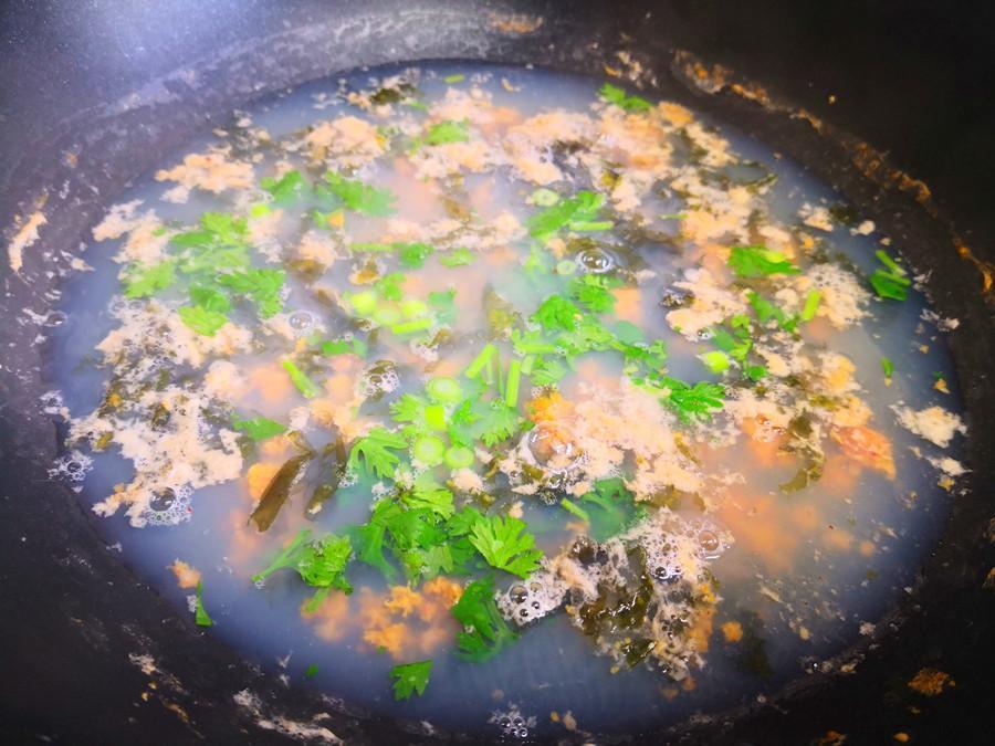 2.鍋中加水,加入蔥段和薑片(目的是爲了給海膽去腥)燒開,然後把挖出來的海膽黃倒入鍋中,煮至水再次沸騰後把姜和蔥撈出不要,如果有浮沫,先用勺子把浮沫撇一撇,然後再加入適量的紫菜和食鹽,攪勻後再繼續加入適量的水澱粉勾芡,攪至湯汁粘稠後即可關火,出鍋前再加點小蔥花和香菜提鮮,鮮美極了!