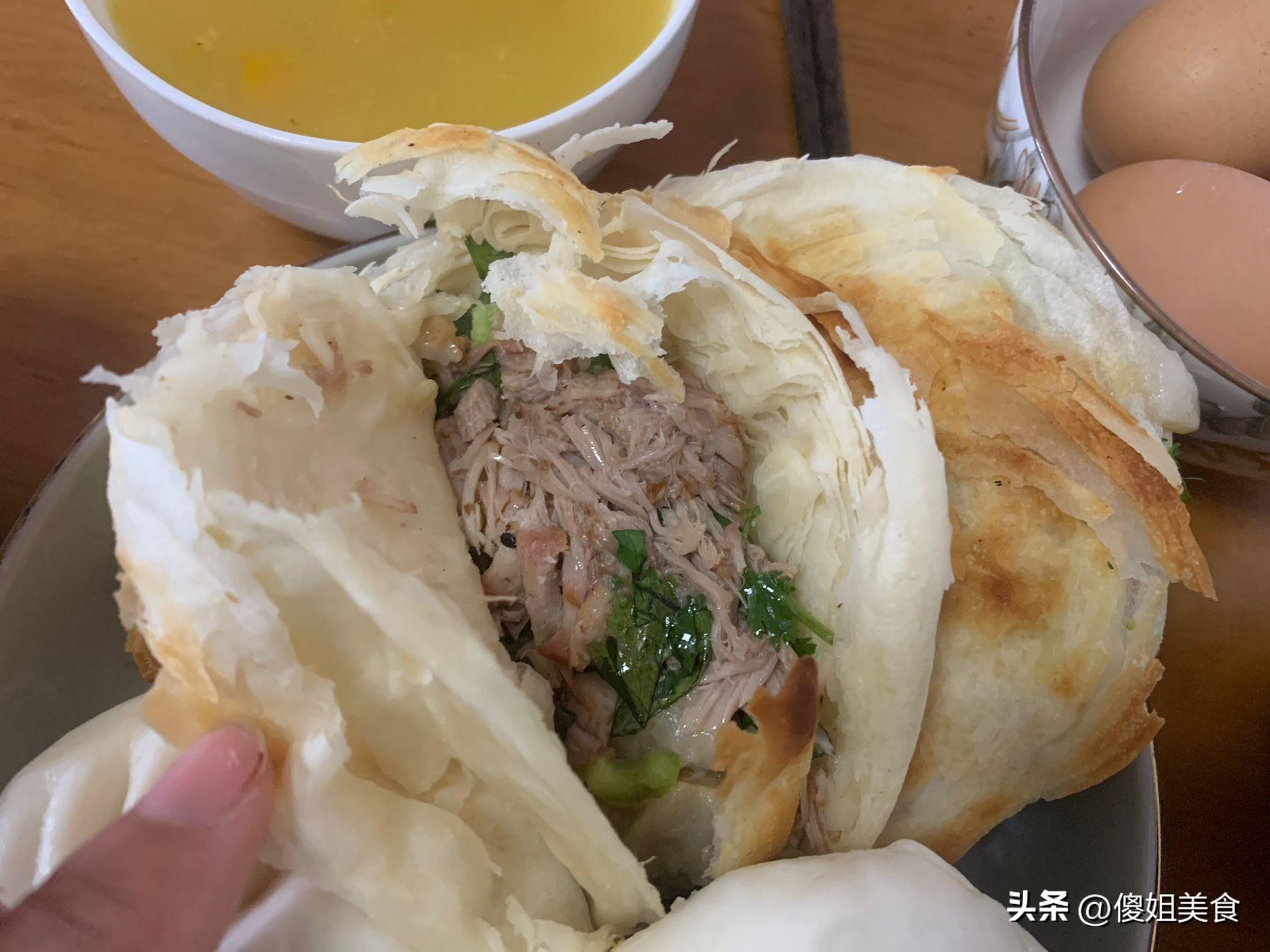 前幾天燉了一些紅燒肉沒有喫完,孩子們喫了幾頓也喫膩了。我特意留了一小塊面,給孩子們做了個肉夾饃。把麪糰分成小塊,擀成一層層的薄餅,放在電餅鐺上煎熟透,最後往裏面夾入燉碎後的紅燒肉,再來點香菜,澆點湯汁,看着就流口水,賊香。