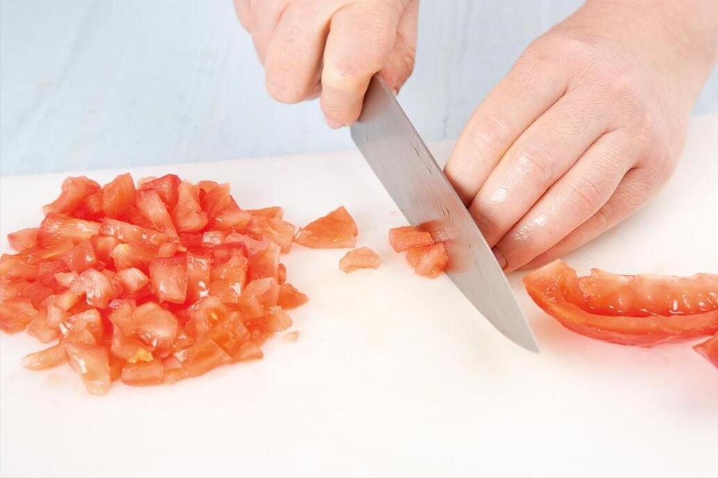 2、緊接着將西紅柿切成小塊,放在一旁備用,然後再將香蔥切好,切成蔥花備用,接下來準備幾個雞蛋,再準備一個小碗,將雞蛋打到裏面就可以了,來點清水充分攪散,準備工作就做好了。