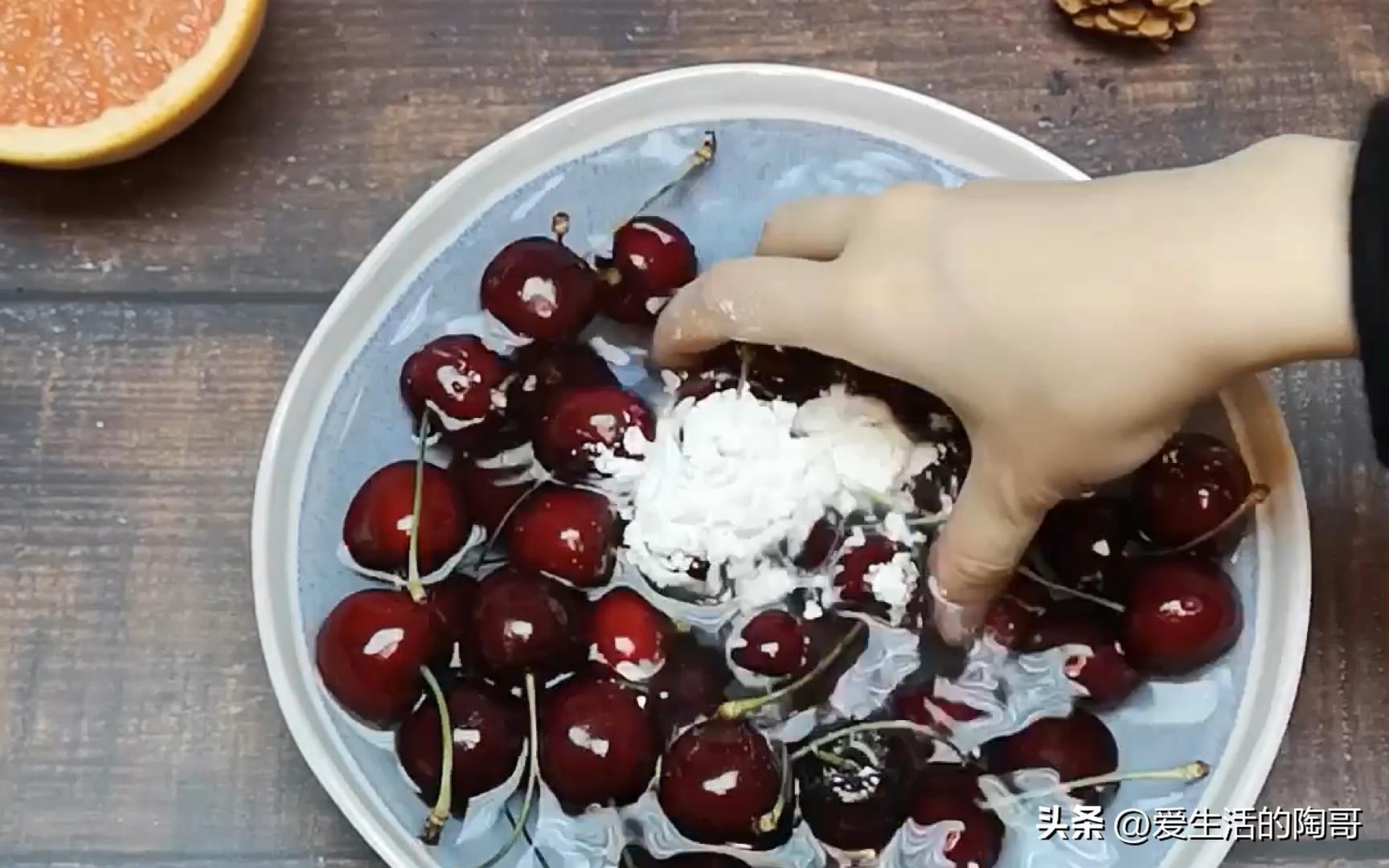 做法:1新鮮櫻桃清洗,放進水裏浸泡,加入一點麪粉