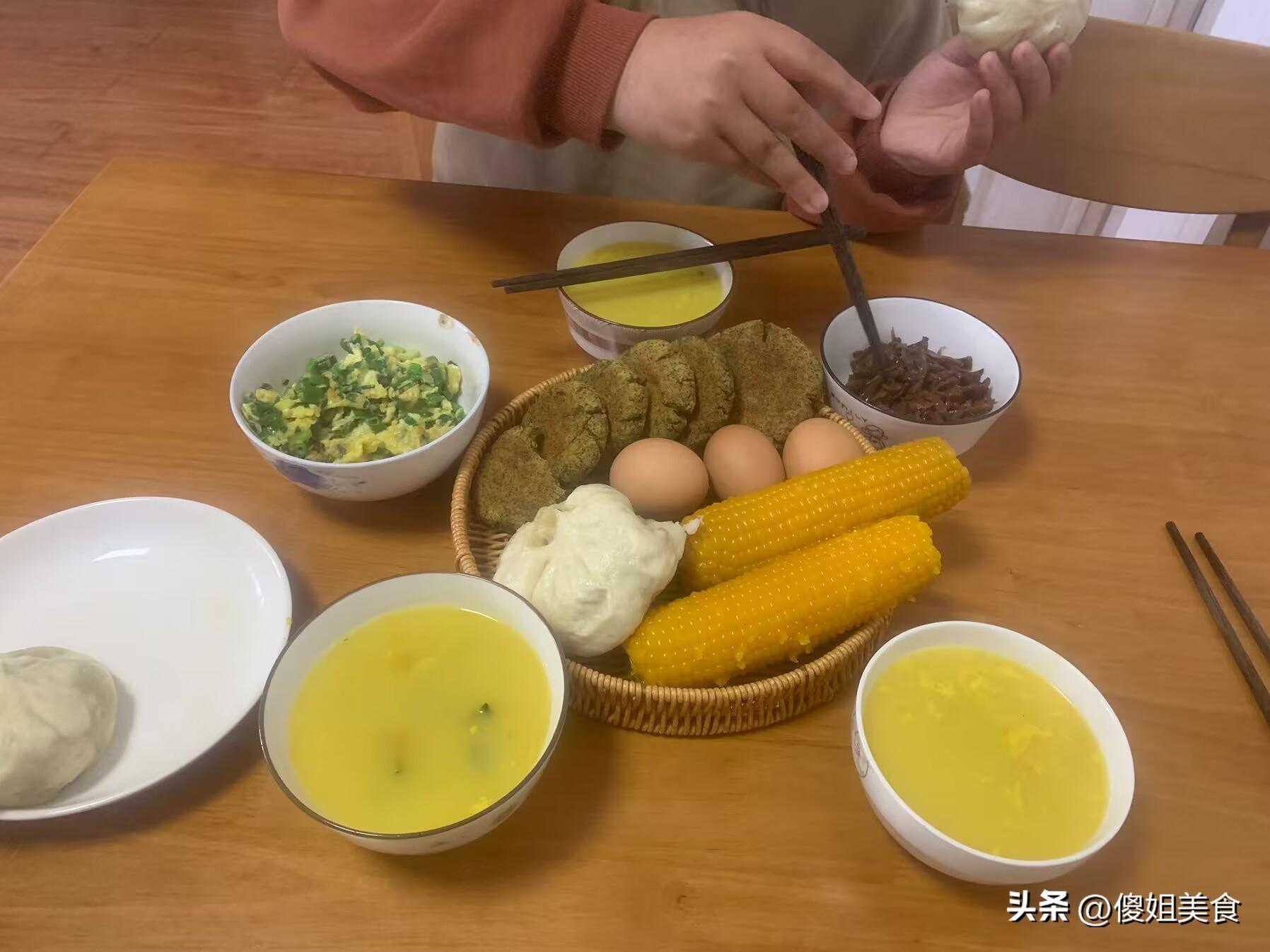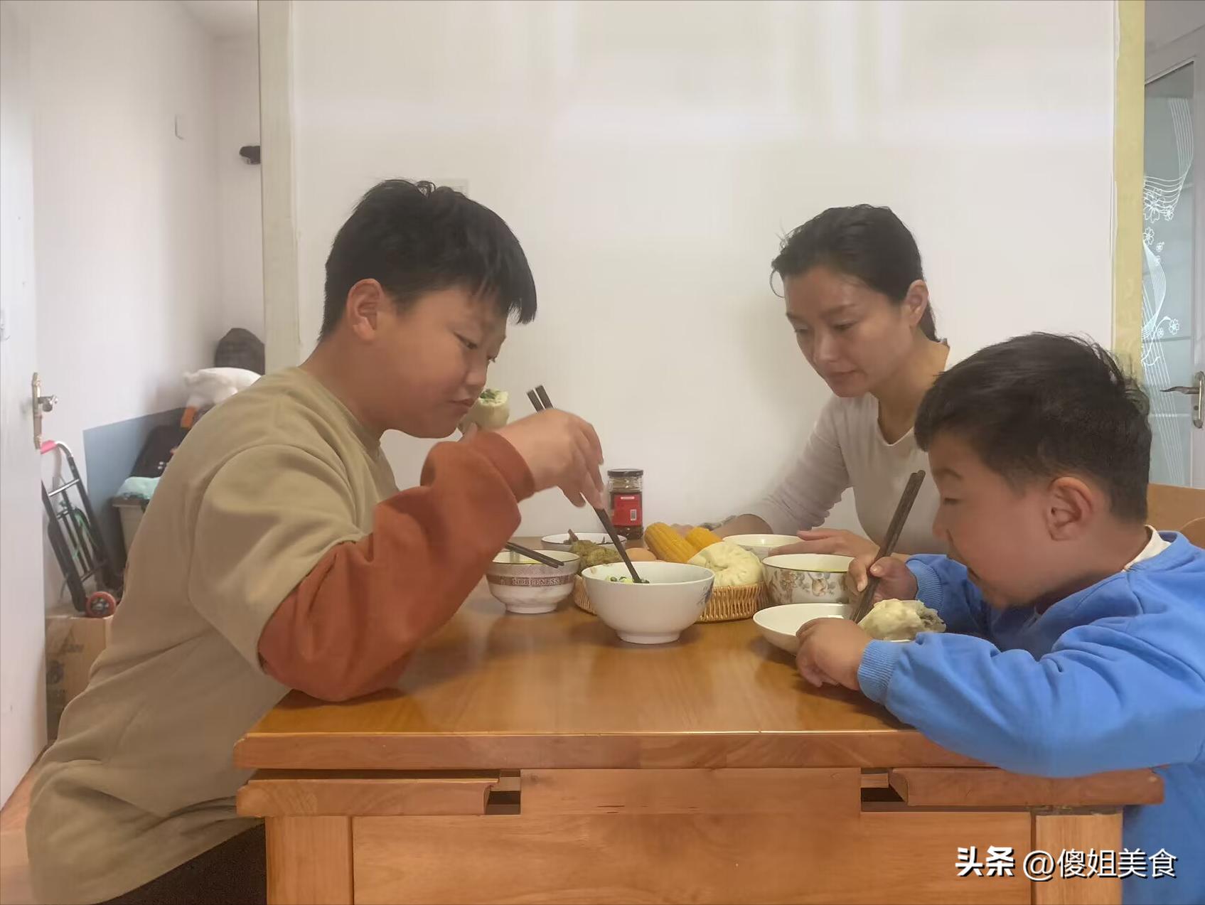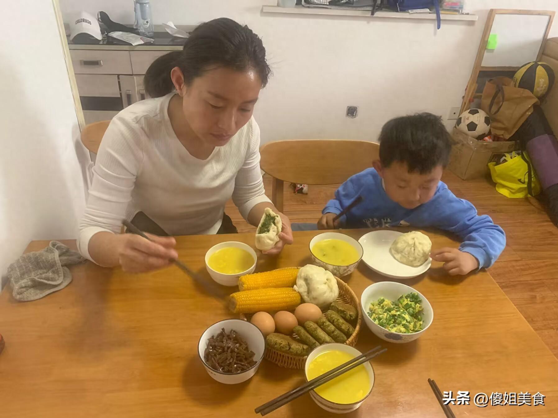 家裏還剩一小把韭菜,再不喫就壞了,切碎了和雞蛋搭配炒了炒,口感鮮美,還挺好喫。煮的南瓜玉米粥,娘三個一人一碗。孩子們拿着大包子開始喫,邊喫邊說,還是媽媽蒸的包子好喫。