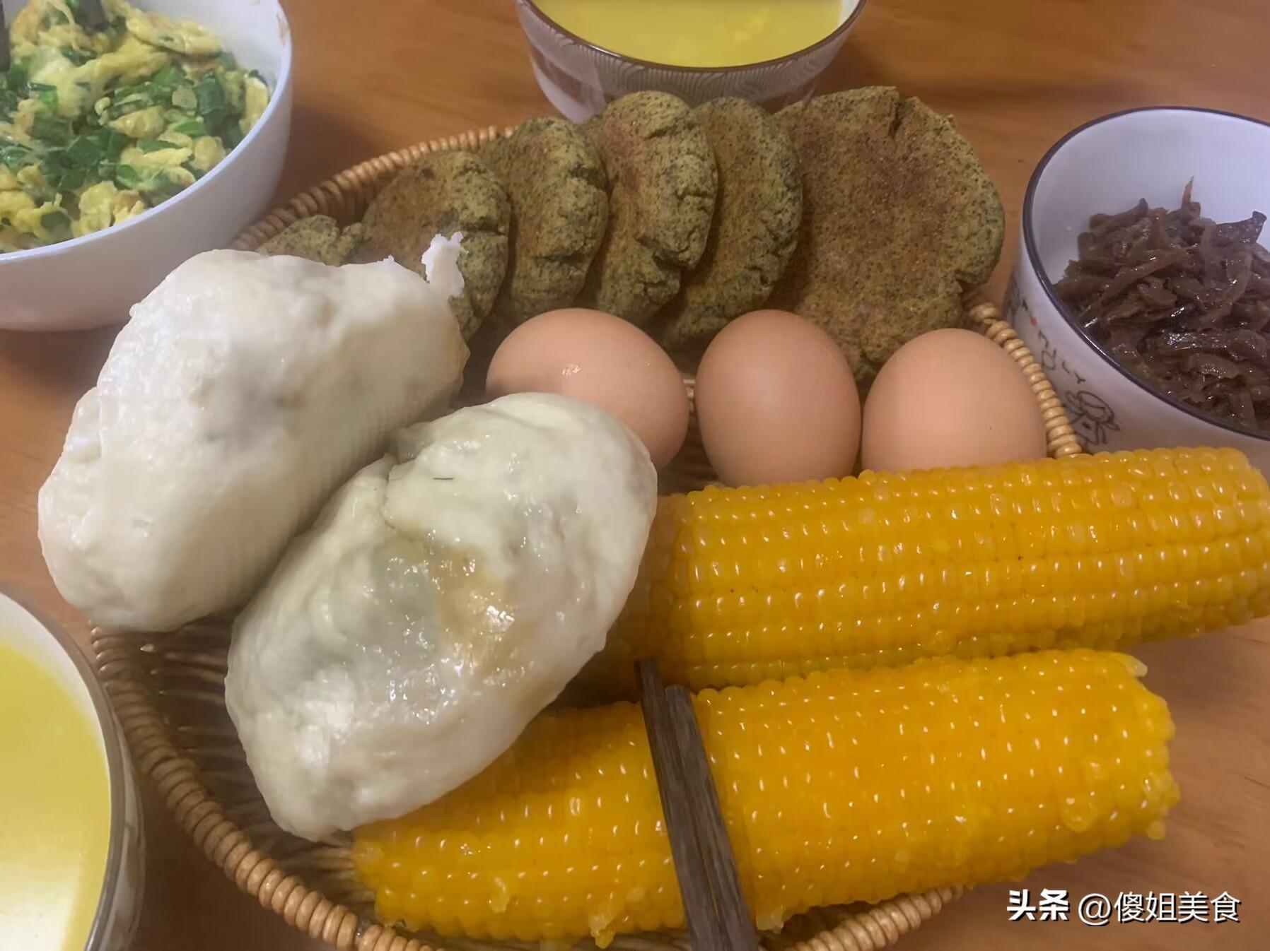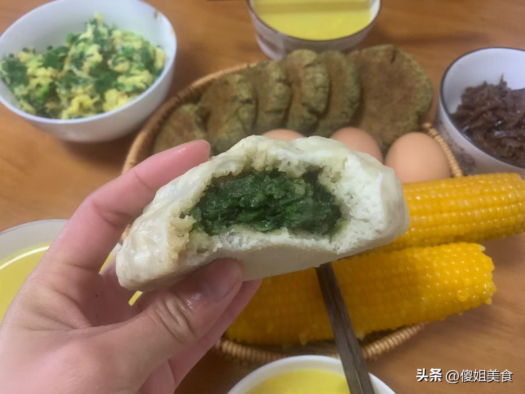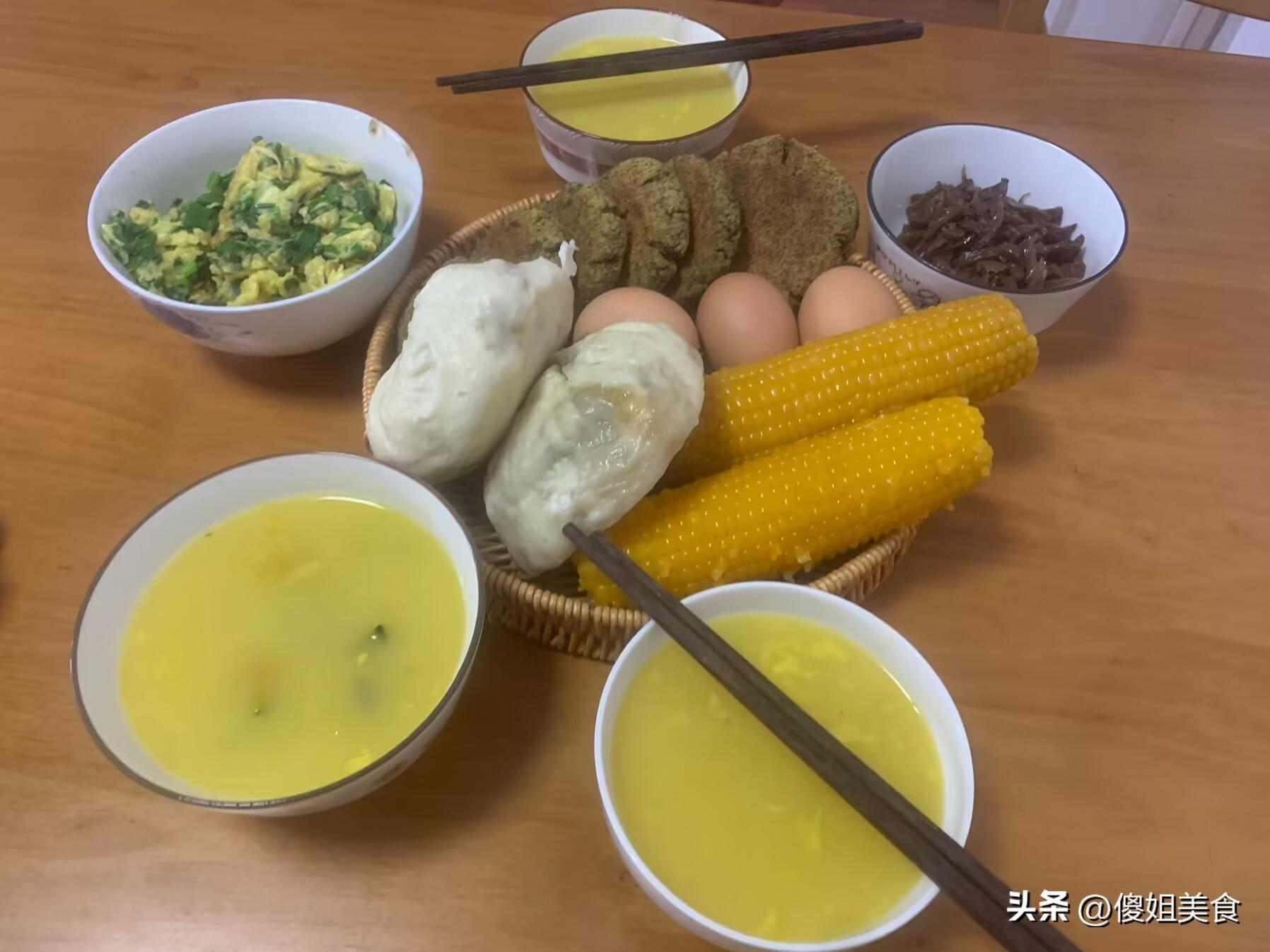 家裏還剩一小把韭菜,再不喫就壞了,切碎了和雞蛋搭配炒了炒,口感鮮美,還挺好喫。煮的南瓜玉米粥,娘三個一人一碗。孩子們拿着大包子開始喫,邊喫邊說,還是媽媽蒸的包子好喫。