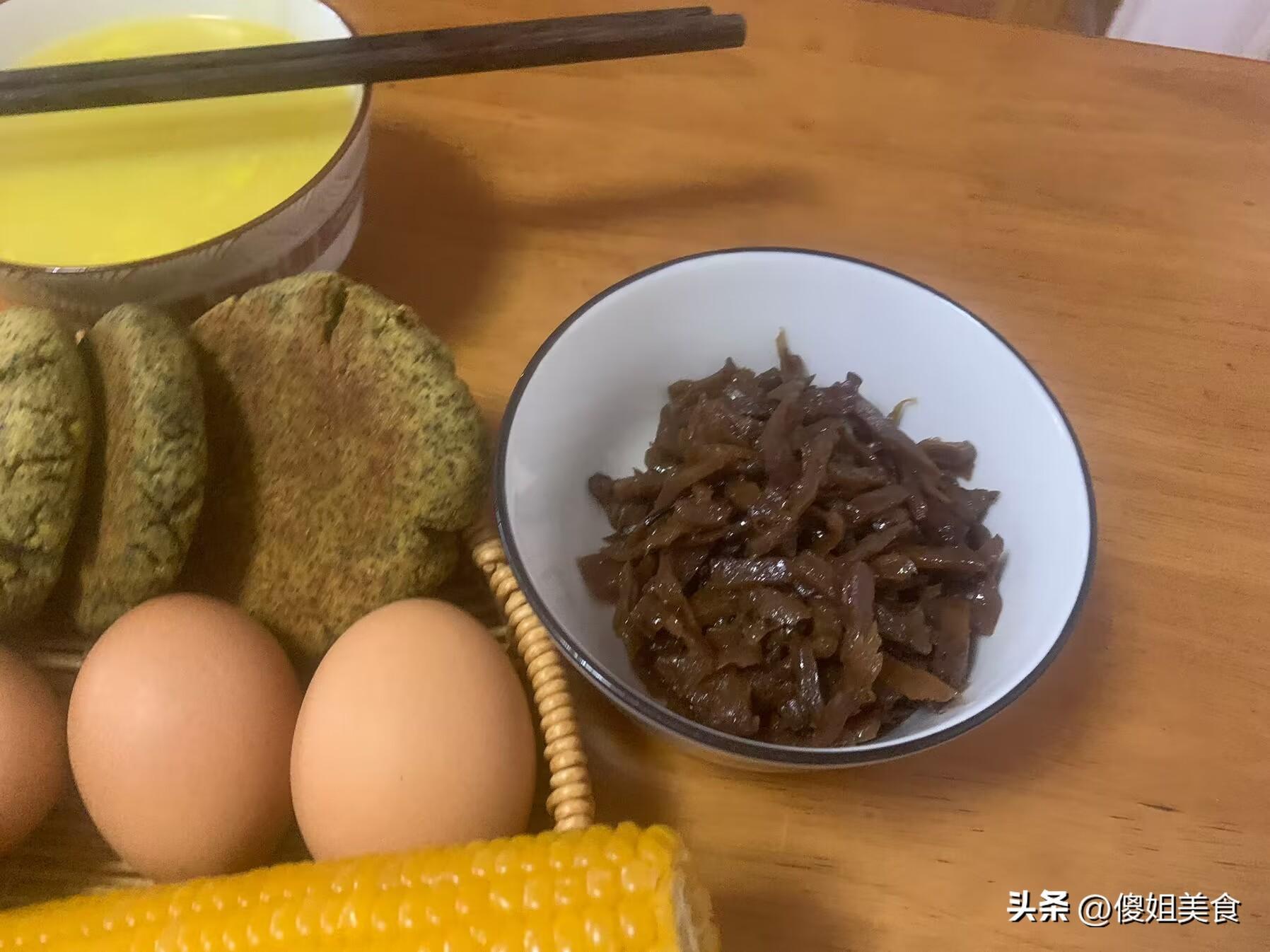 去年春天的時候還凍了一些婆婆自己種的粘玉米,正好放在蒸饅頭的鍋中煮一下,煮的時間久一些口感更軟糯。去年的玉米冷凍到現在還和新鮮的一樣好喫。借用蒸饅頭的時間我還貼了幾個三合面的餅子,我比較喜歡喫粗糧,每次都是婆婆給磨一些三合面(用黑豆、黃豆、小米一起磨的,都是營養豐富的食材,喫着非常香),用電餅鐺一煎超好喫。