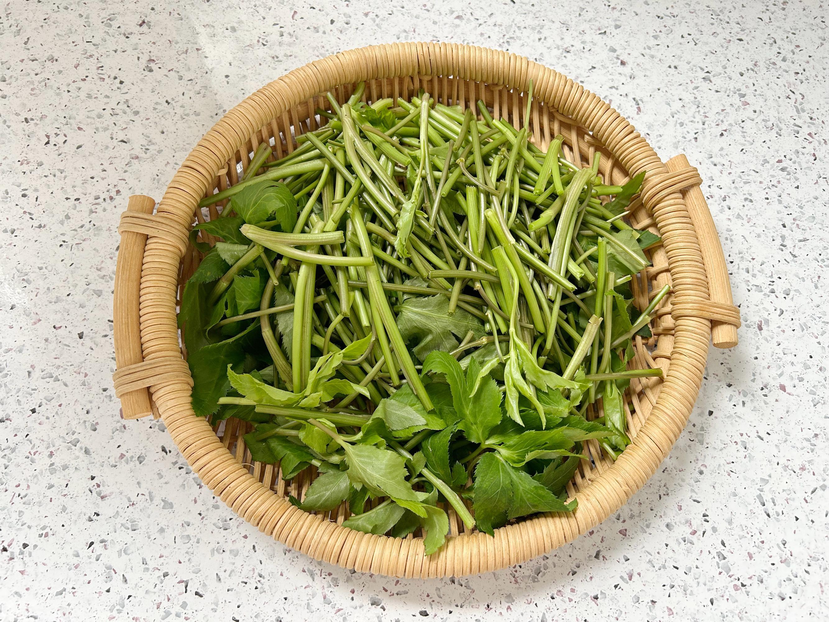 鴨腳板菜摘成合適的長度,反覆清洗幾次,瀝一下水分。鴨腳板菜炒臘肉的話,用莖幹炒比較好喫,葉子可以用來炒雞蛋或者煮湯。
