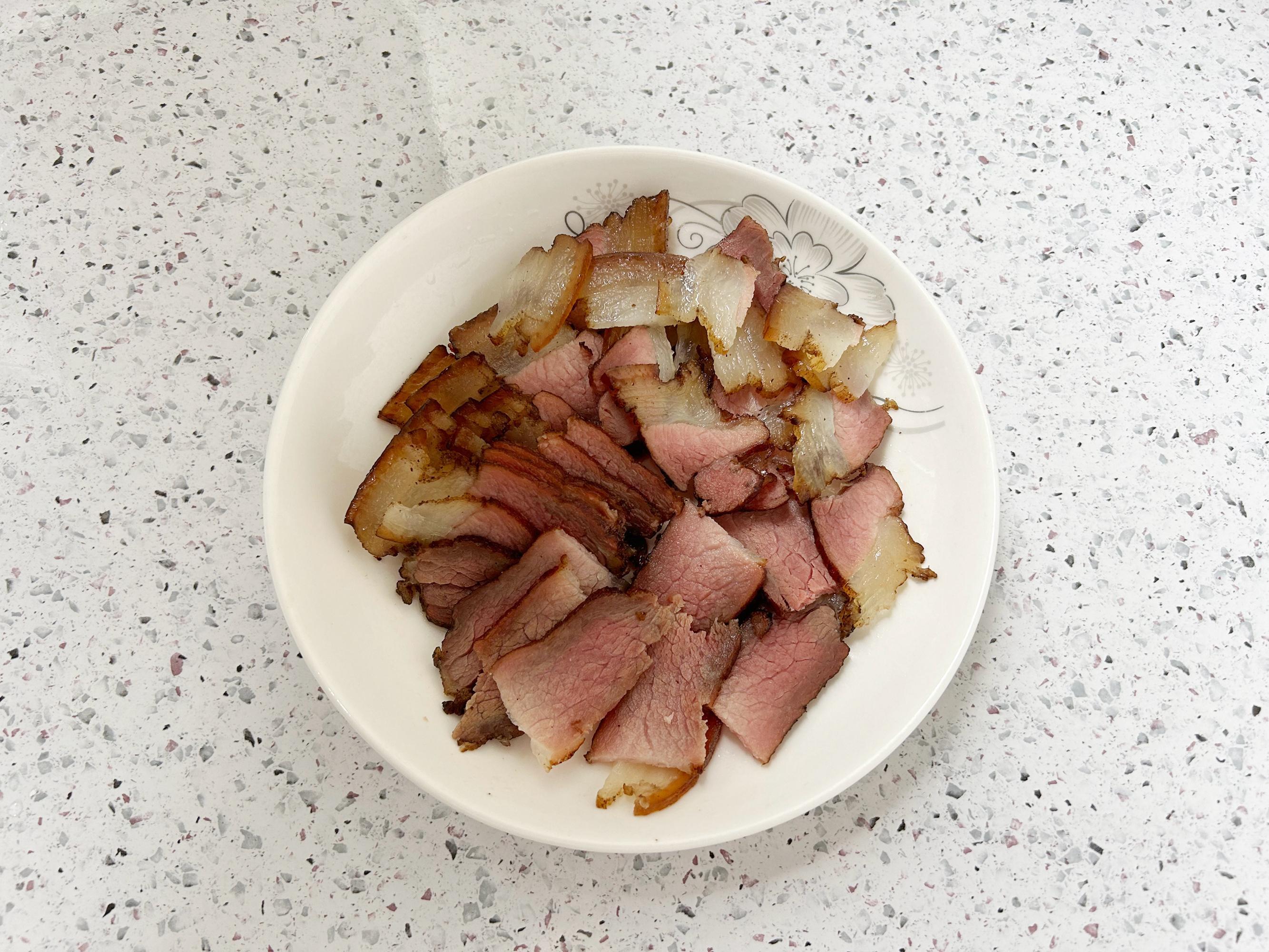 把臘肉切成薄片,生薑去皮切絲,大蒜拍扁去皮切顆粒,小米椒切絲